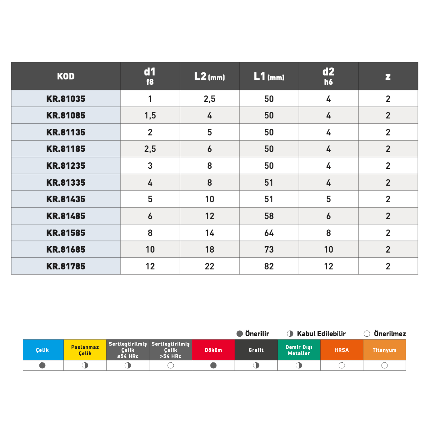 Sertleştirilmiş çelik (>54 HRC), HRSA ve titanyum malzemelerde kullanımı önerilmez.