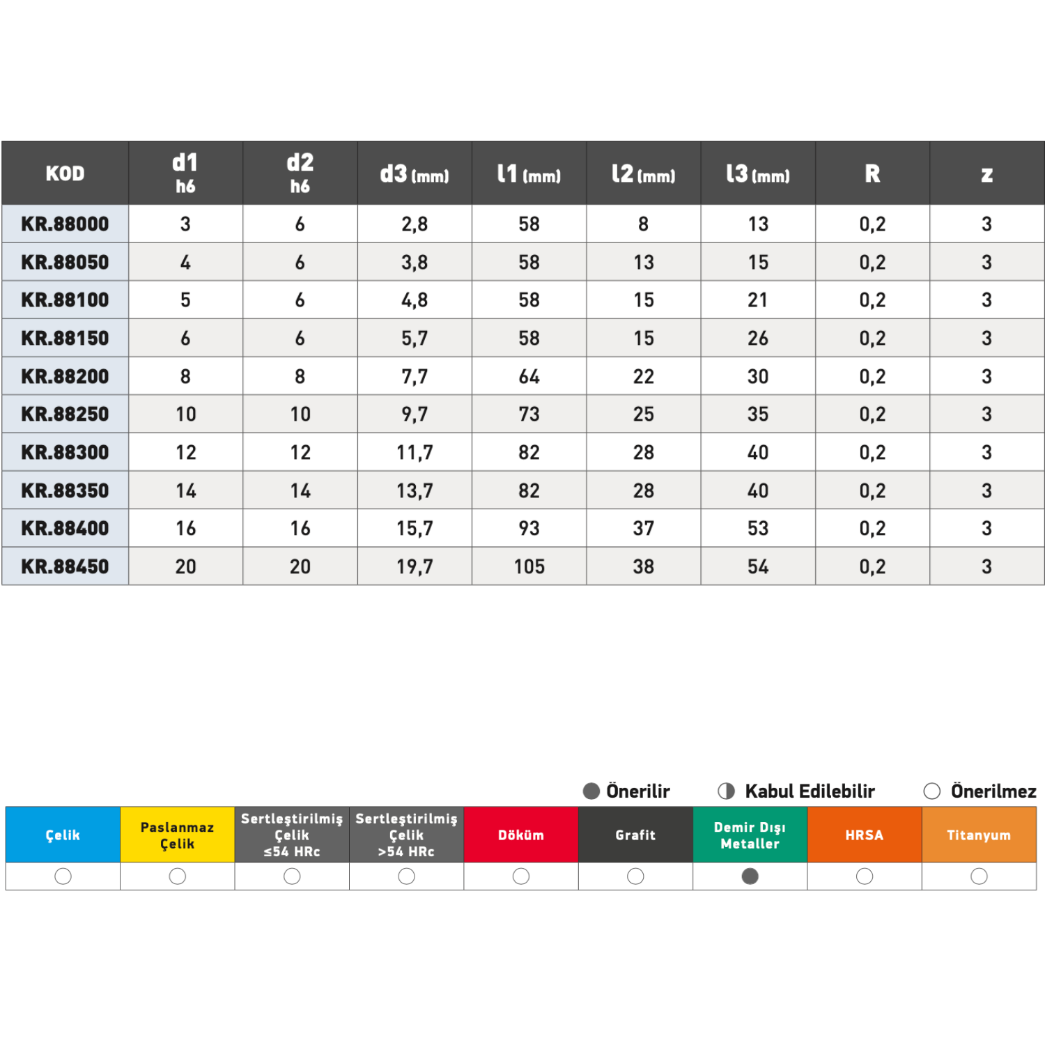 Kraft 3 Ağız Kısa Alüminyum Karbür Parmak Freze | Z3 | Parlak Yüzey İşleme