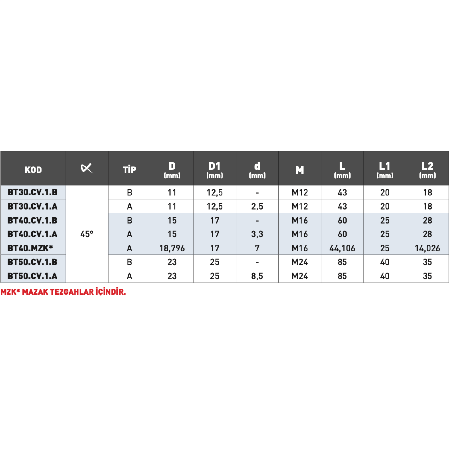 • Kodlar: BT30.CV.1.A / BT30.CV.1.B / BT40.CV.1.A / BT40.CV.1.B / BT40.MZX / BT50.CV.1.A / BT50.CV.1.B