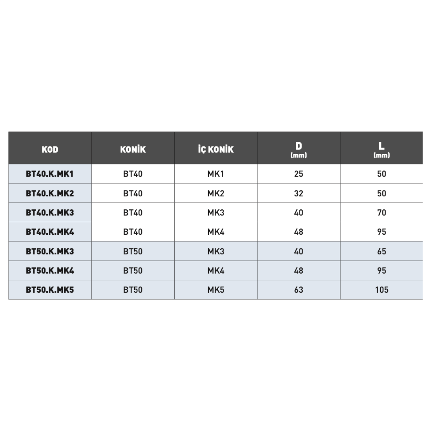BT40 ve BT50 konik modelleriyle, Mors konik uçların (MK1–MK5) tezgâh sistemlerine güvenli şekilde bağlanmasını sağlar.
