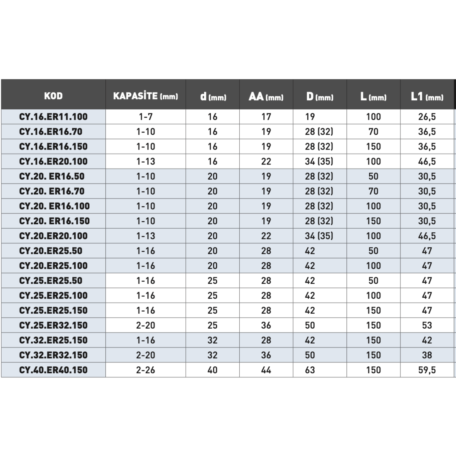 • Kod: CY16.ER11.100 / CY16.ER16.150 / CY20.ER16.150 / CY25.ER20.100 / CY25.ER25.100 / CY32.ER25.150 / CY32.ER32.150 / CY40.ER40.150