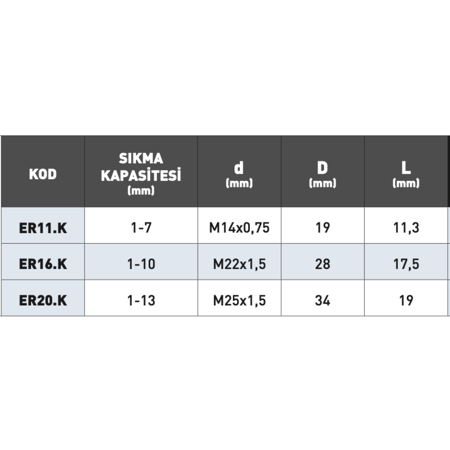 ER11.K, ER16.K, ER20.K modelleri, anahtar yardımıyla kolay montaj ve sökme imkânı sunar.