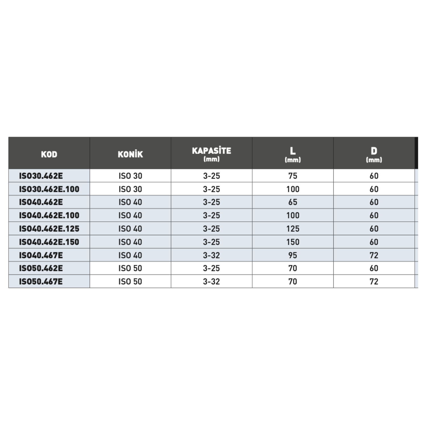 • Kapasite Aralığı: ISO30 modelde 2–20 mm, ISO40 ve ISO50 modellerde 2–26 mm