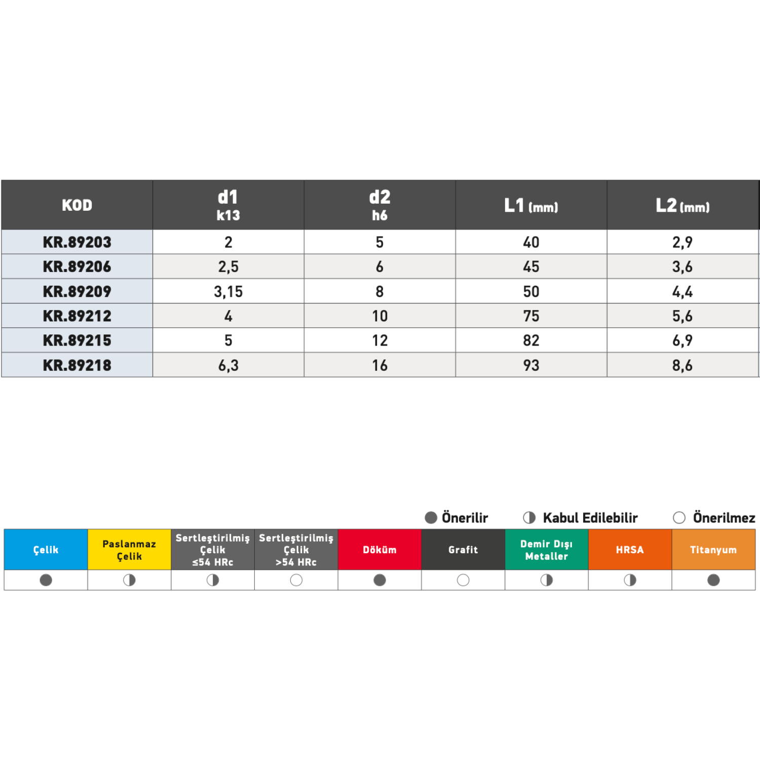 • Sertleştirilmiş çelik ≤ 54 HRC (kabul edilebilir)