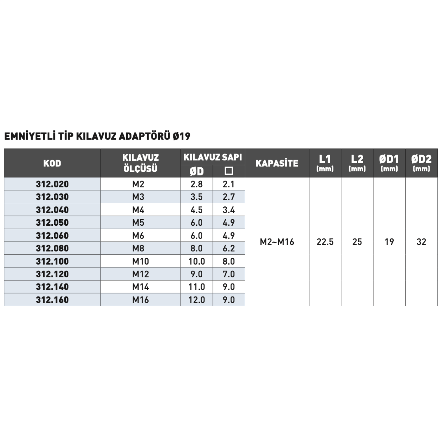 • Kılavuz Sapı Çapı (ØD): 2.8 – 28 mm
