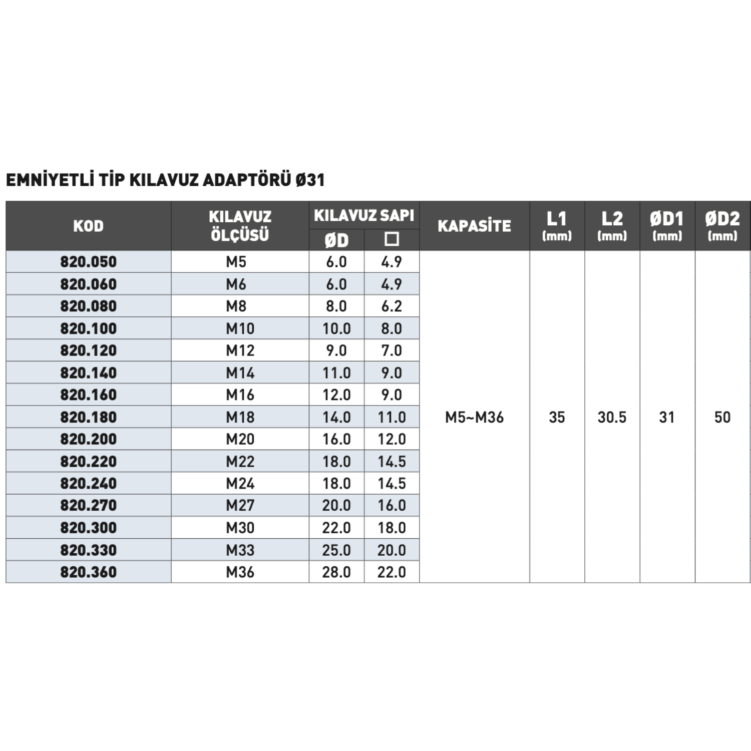 • Kılavuz Ölçüsü: M3 – M36