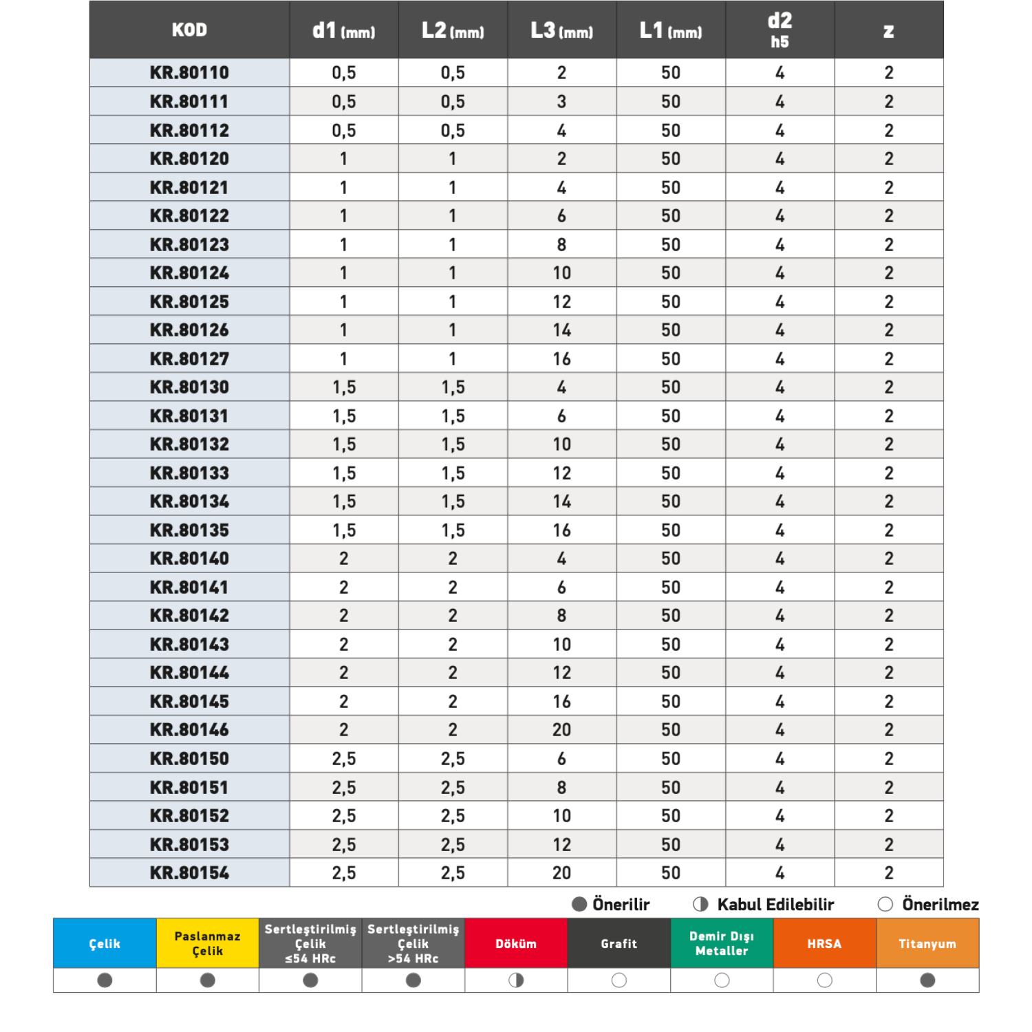 • Sertleştirilmiş çelik ≤ 54 HRC (kabul edilebilir)
