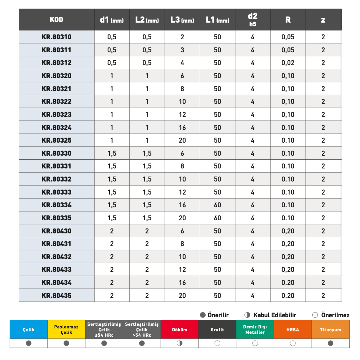 • Radyüs Değerleri: R0.05 mm – R0.20 mm