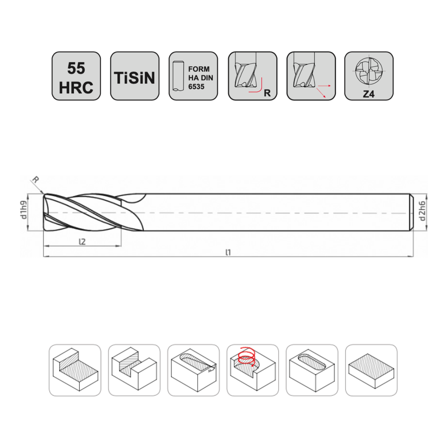 TiSiN (Titanyum Silisyum Nitrür) kaplaması sayesinde yüksek sıcaklık direnci ve aşınma dayanımı sunan bu frezeler, 55 HRC’ye kadar olan çelik türlerinde yüksek verimlilikle çalışır.