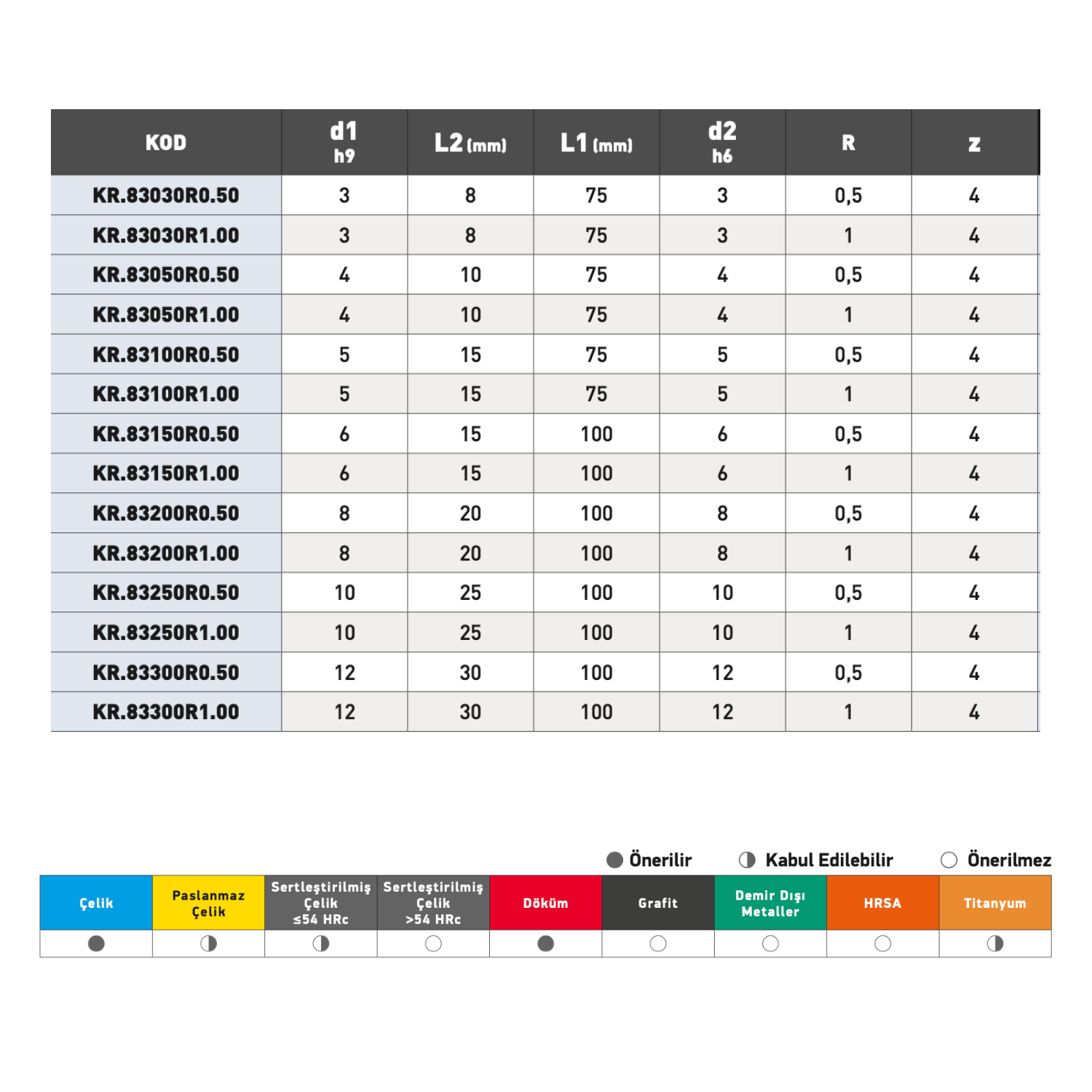 Sertleştirilmiş çelik (>54 HRC), HRSA ve titanyum malzemelerde kullanımı önerilmez.