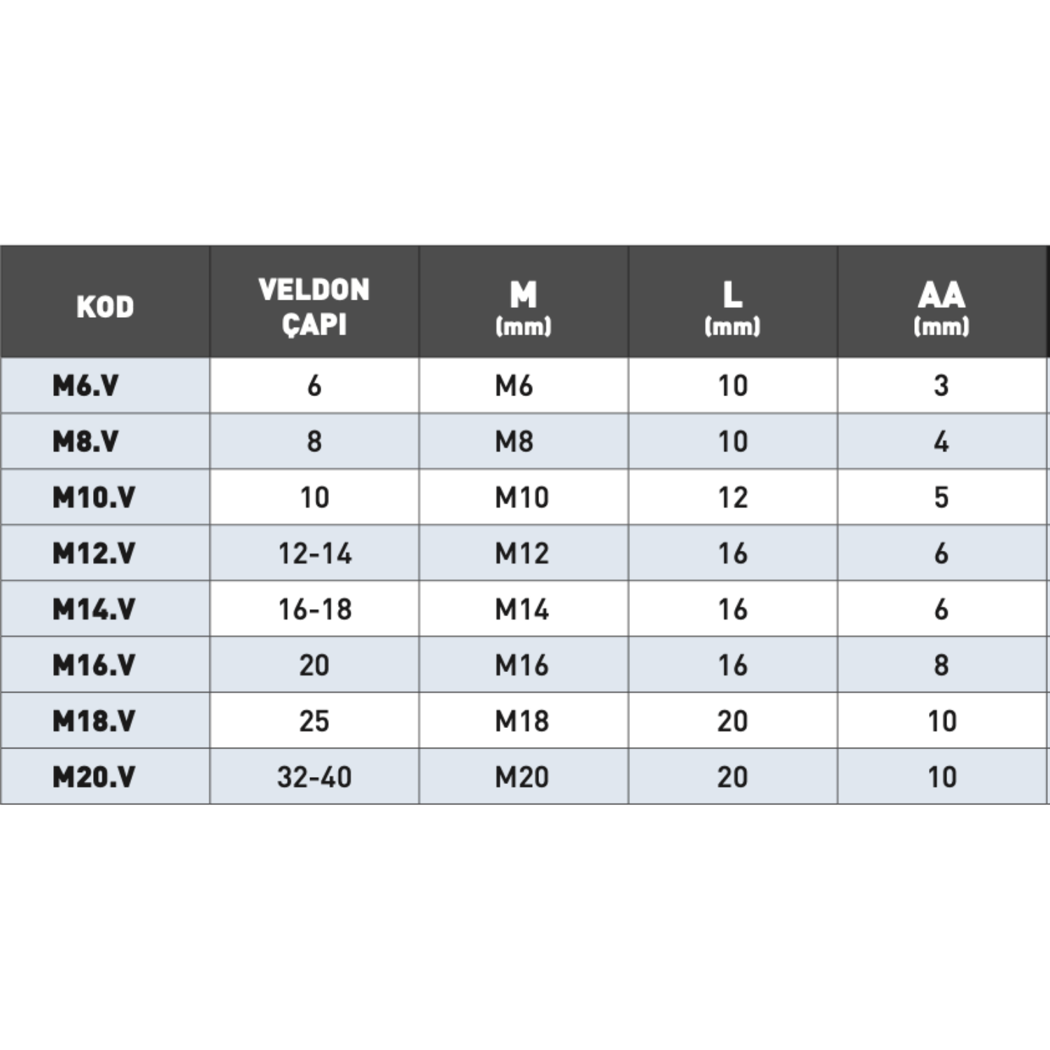 • Kodlar: M6V – M20V