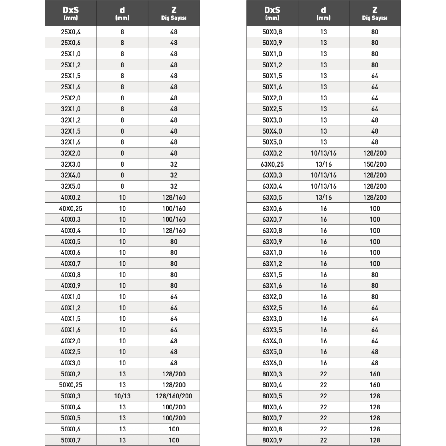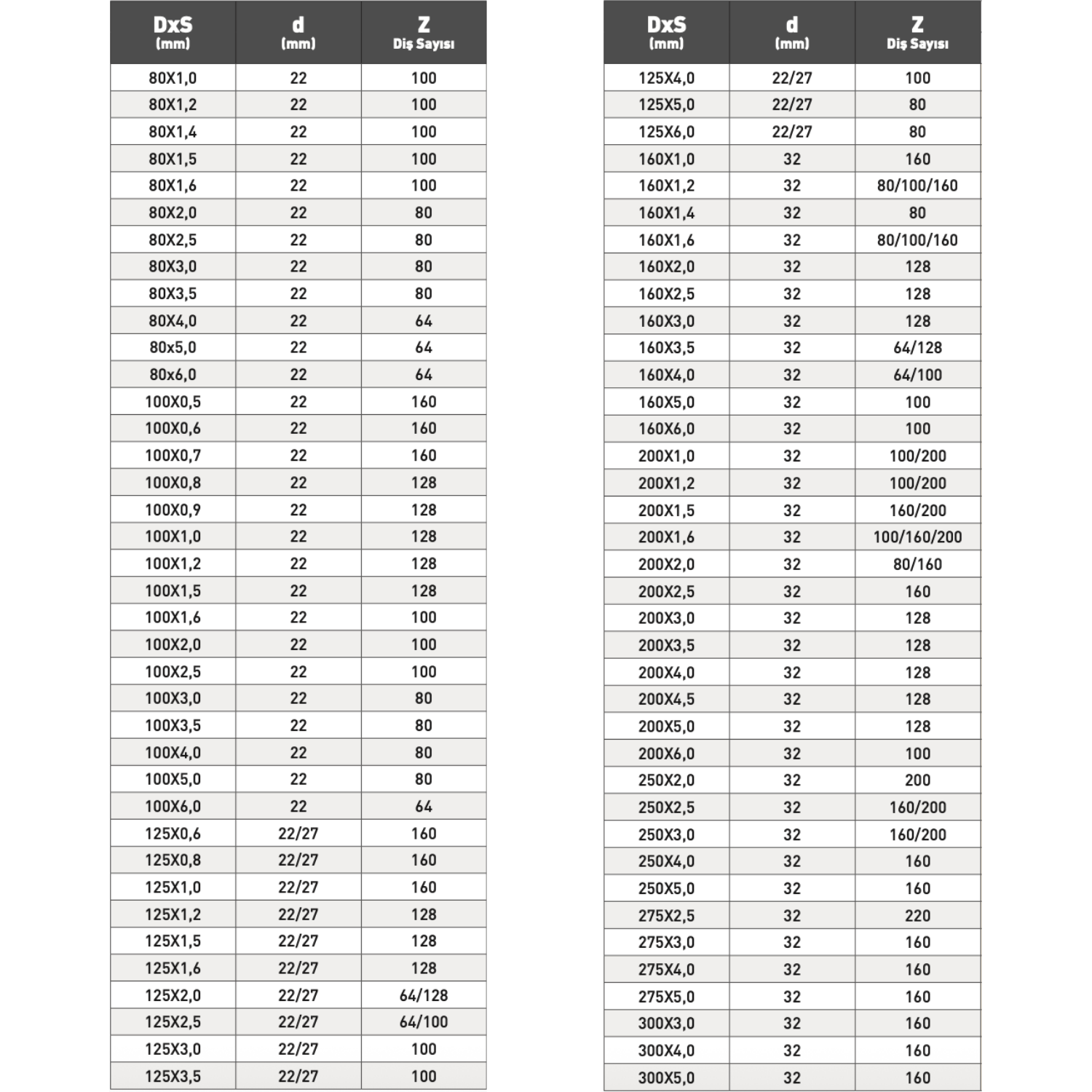 25 mm’den 300 mm’ye kadar geniş çap çeşitleri ve farklı diş sayısı kombinasyonları ile ihtiyaca uygun seçenekler sunar.