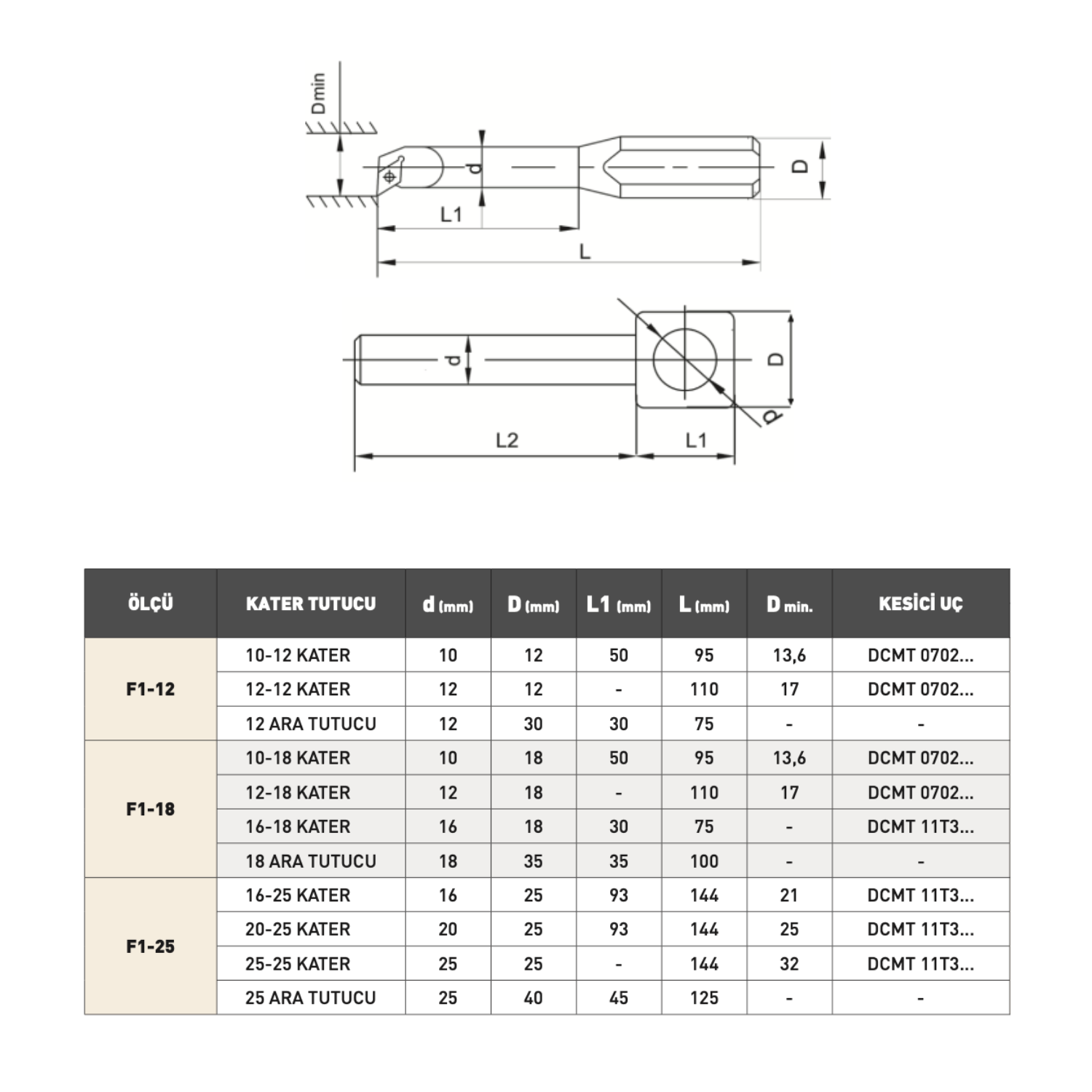Delik büyütme başlıkları ile birlikte kullanılan bara takımı, farklı çap aralıklarında hassas talaş kaldırma işlemleri için tasarlanmıştır. F1-12, F1-18 ve F1-25 başlıklarına uygun olarak 10–12 mm, 12–18 mm, 16–25 mm katar tutucu seçenekleri sunar.