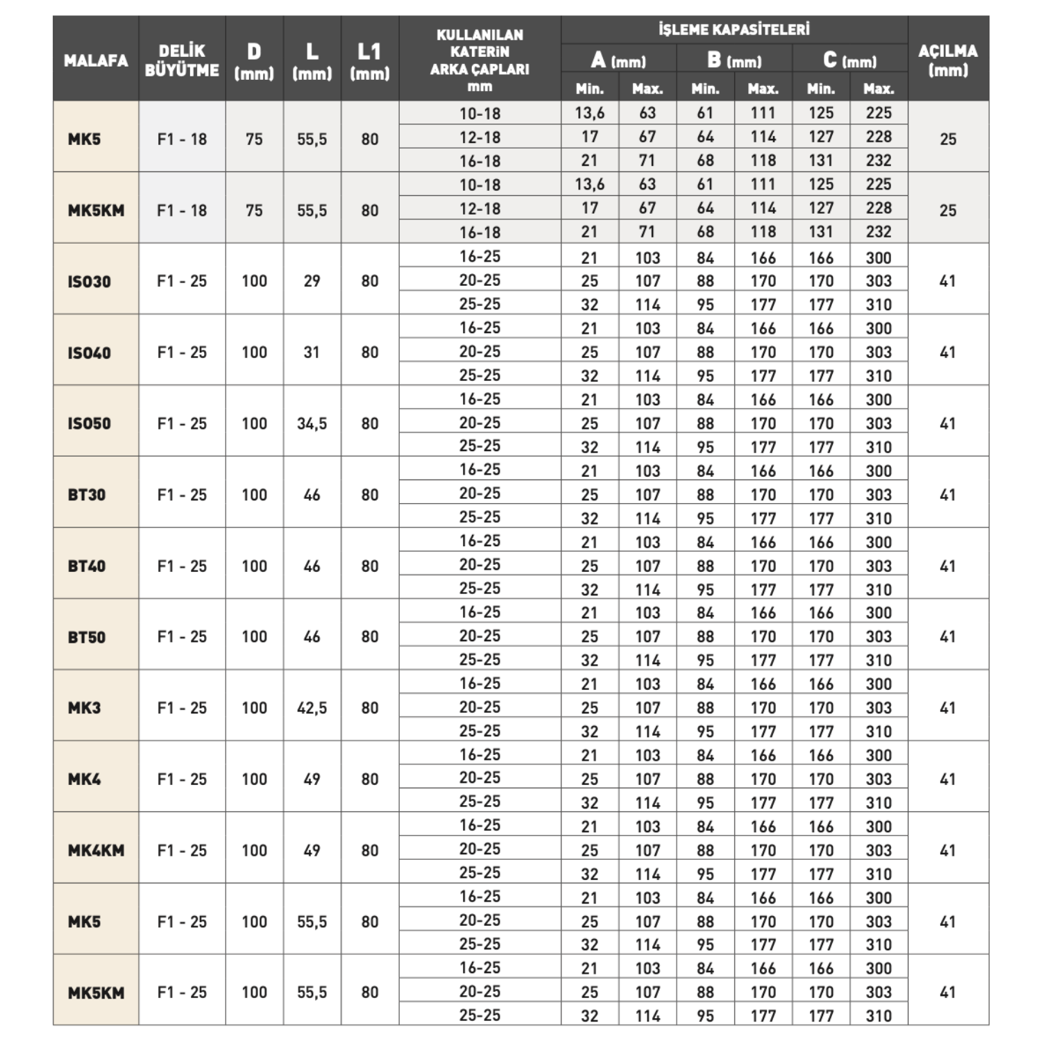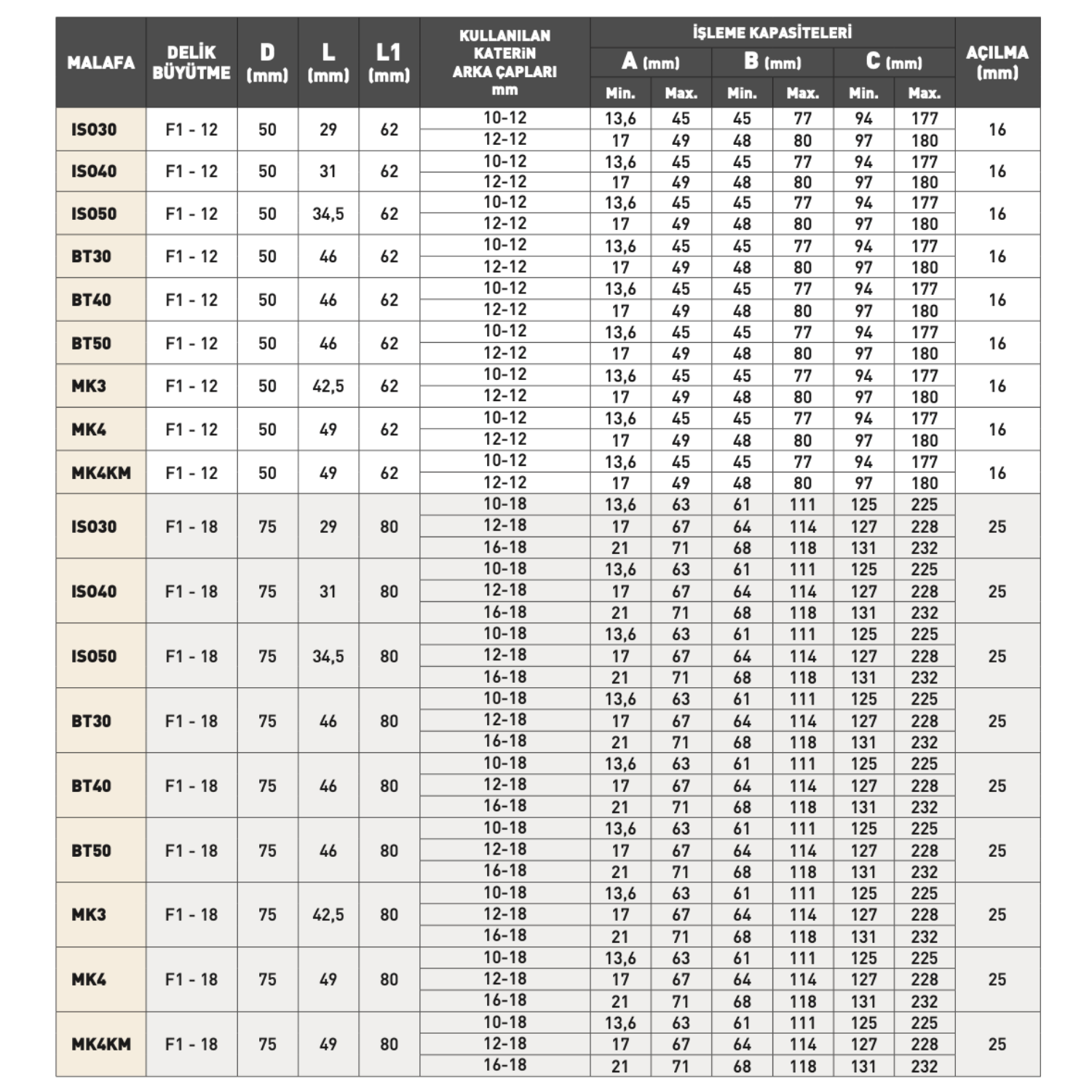 25 mm, 41 mm ve daha büyük açılma kapasitelerine sahip modelleriyle set; F1-12, F1-18 ve F1-25 delik büyütme başlıklarıyla sunulmaktadır. Kullanılan katarin arka çapları modele göre 10–12 mm, 12–18 mm, 16–25 mm aralığında değişir. Bu sayede hem ince işlerde hem ağır talaş kaldırma gerektiren operasyonlarda kusursuz sonuç elde edilir.