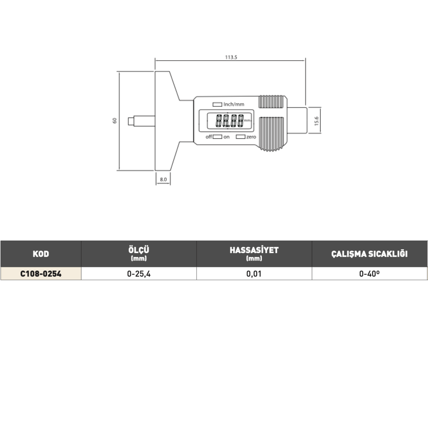 0–25,4 mm ölçüm aralığı ve 0,01 mm hassasiyet sunar.