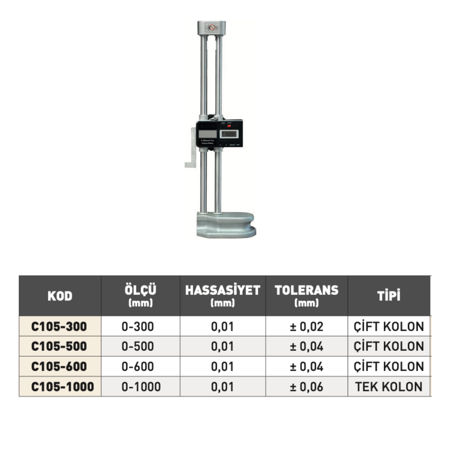 Dijital Yükseklik Mihengirleri, yüzey plakaları üzerinde hassas yükseklik ölçümü, çizim ve işaretleme işlemleri için kullanılan profesyonel cihazlardır. C105 serisi; 0–300 mm’den 0–1000 mm’ye kadar değişen ölçüm aralıkları, 0,01 mm hassasiyet ve çift kolonlu sağlam tasarımı ile endüstriyel kullanımda maksimum doğruluk sunar.