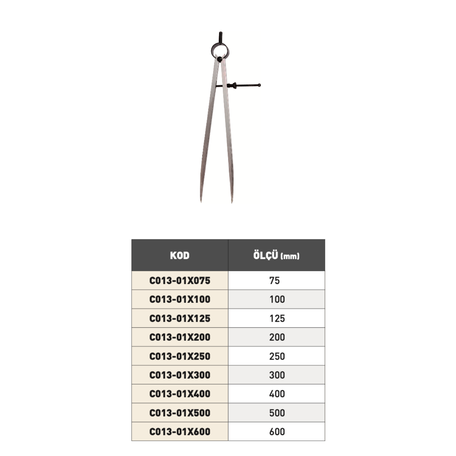 Düz pergel, dış çap ve yay ölçümlerinde kullanılan en temel pergellerden biridir. C013 serisi; 75 mm’den 600 mm’ye kadar geniş ölçü aralıkları ile hem küçük hem büyük çap ölçümlerine uygundur.