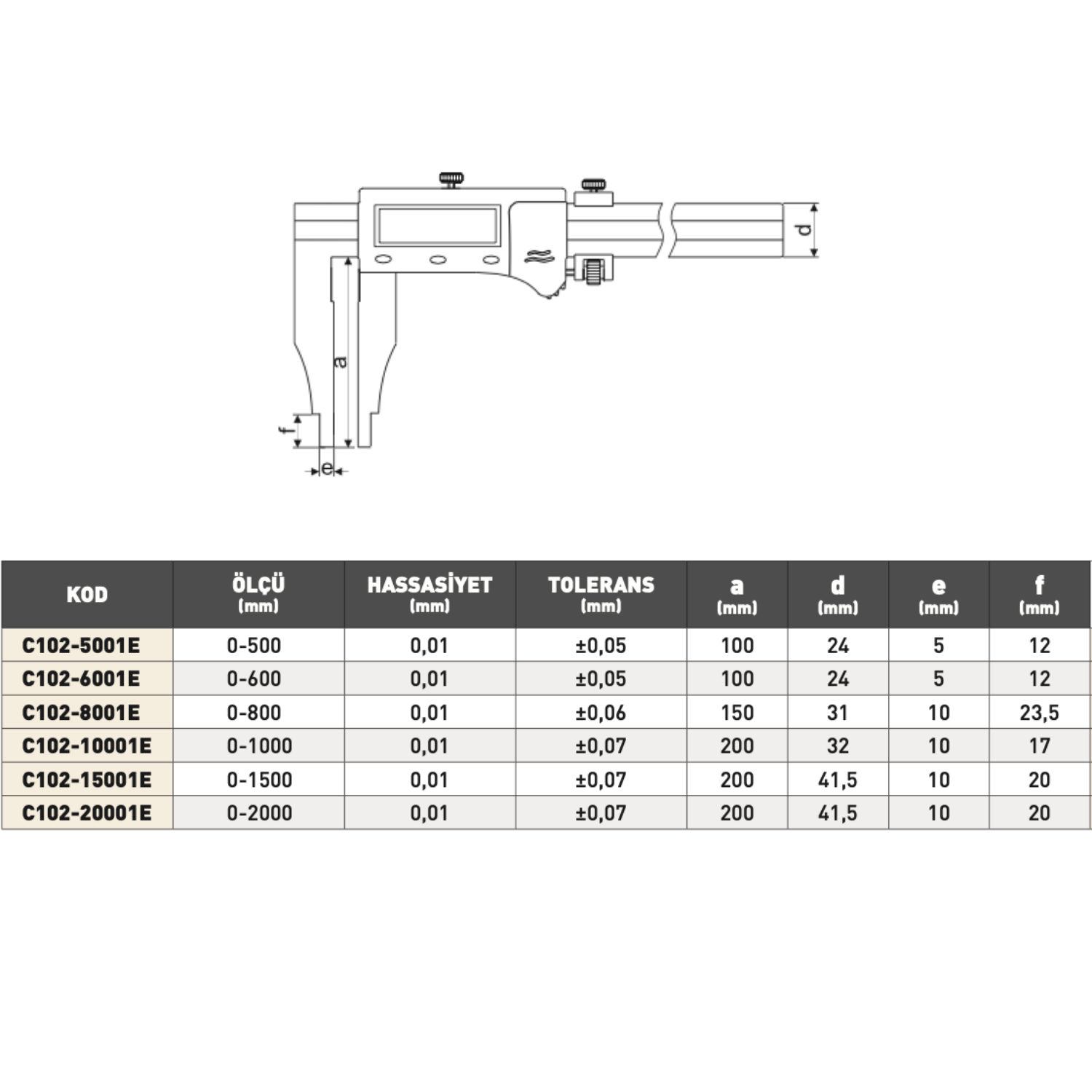 0,01 mm hassasiyet ile uzun mesafelerde dahi kararlı ölçüm sonuçları verir. Çift çelik çene yapısı, esneme olmadan sağlam tutuş sağlar. Makine gövdelerinin ölçümü, levha kalınlığı kontrolü, konstrüksiyon parçalarının ölçüm doğrulaması gibi ağır sanayi uygulamalarında güvenle kullanılır.