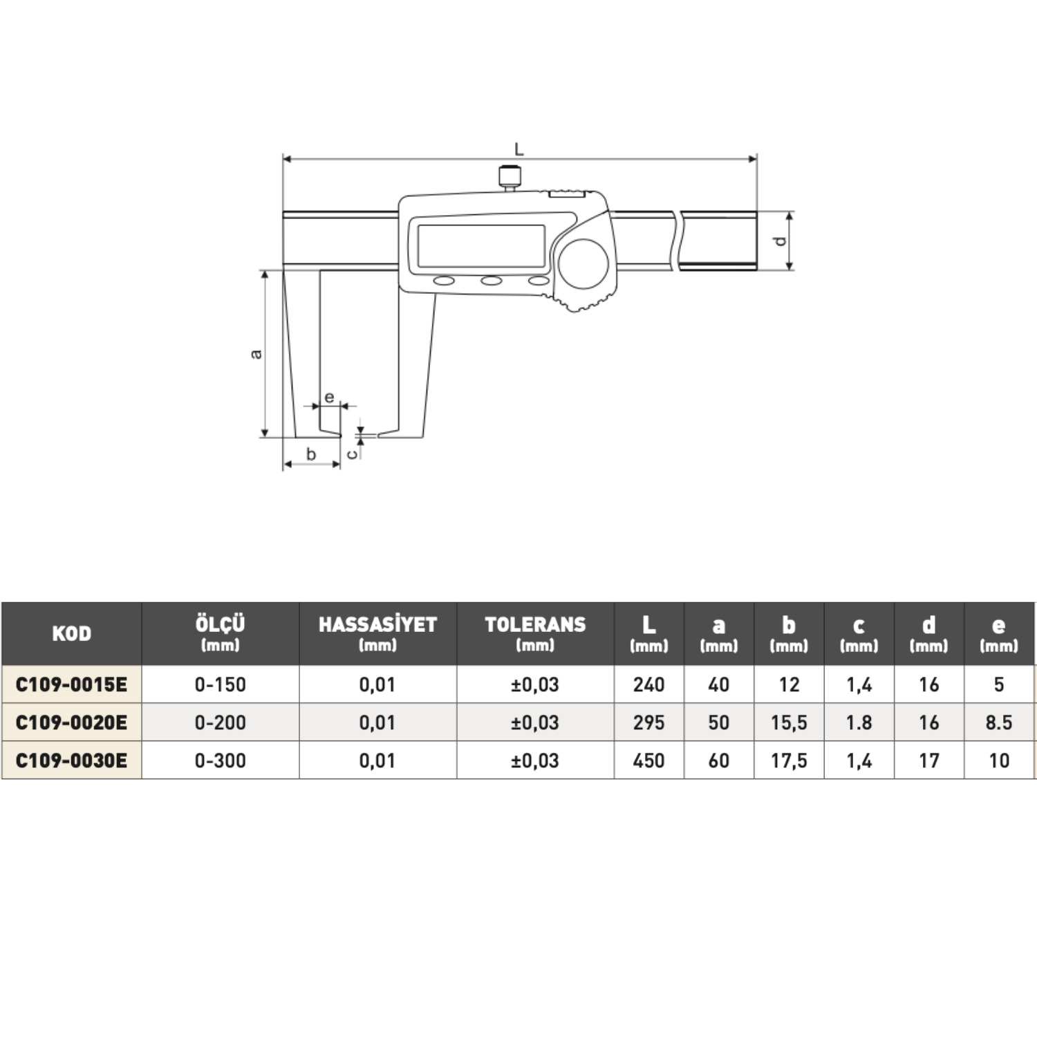 0–150 mm ve 0–300 mm ölçüm kapasitelerine sahiptir. İnce çene yapısı sayesinde küçük ve hassas bölgelerde çalışmaya uygundur.