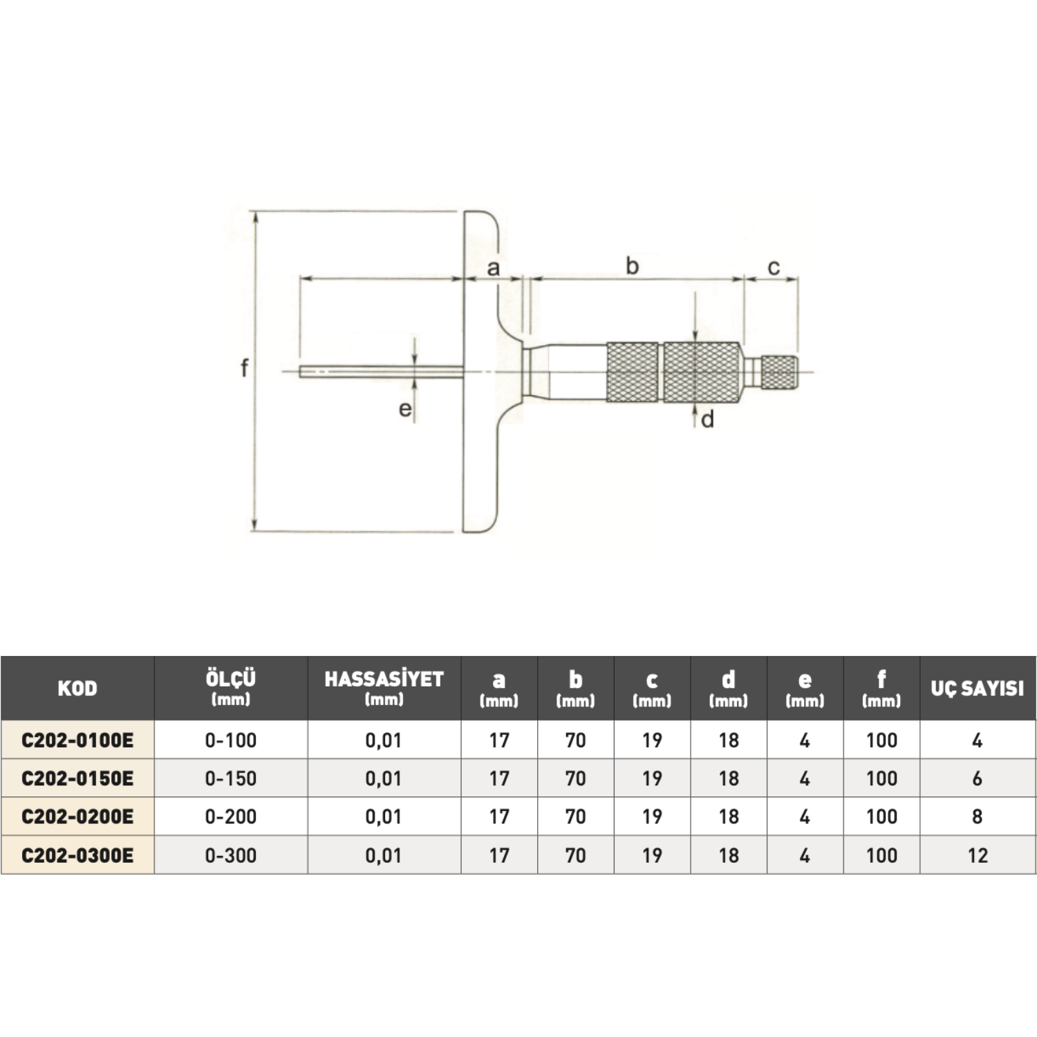 0–100 mm, 0–150 mm, 0–200 mm ve 0–300 mm ölçüm seçeneklerine sahip mekanik derinlik mikrometresi, değiştirilebilir uçları sayesinde farklı derinliklerde kullanılabilir.