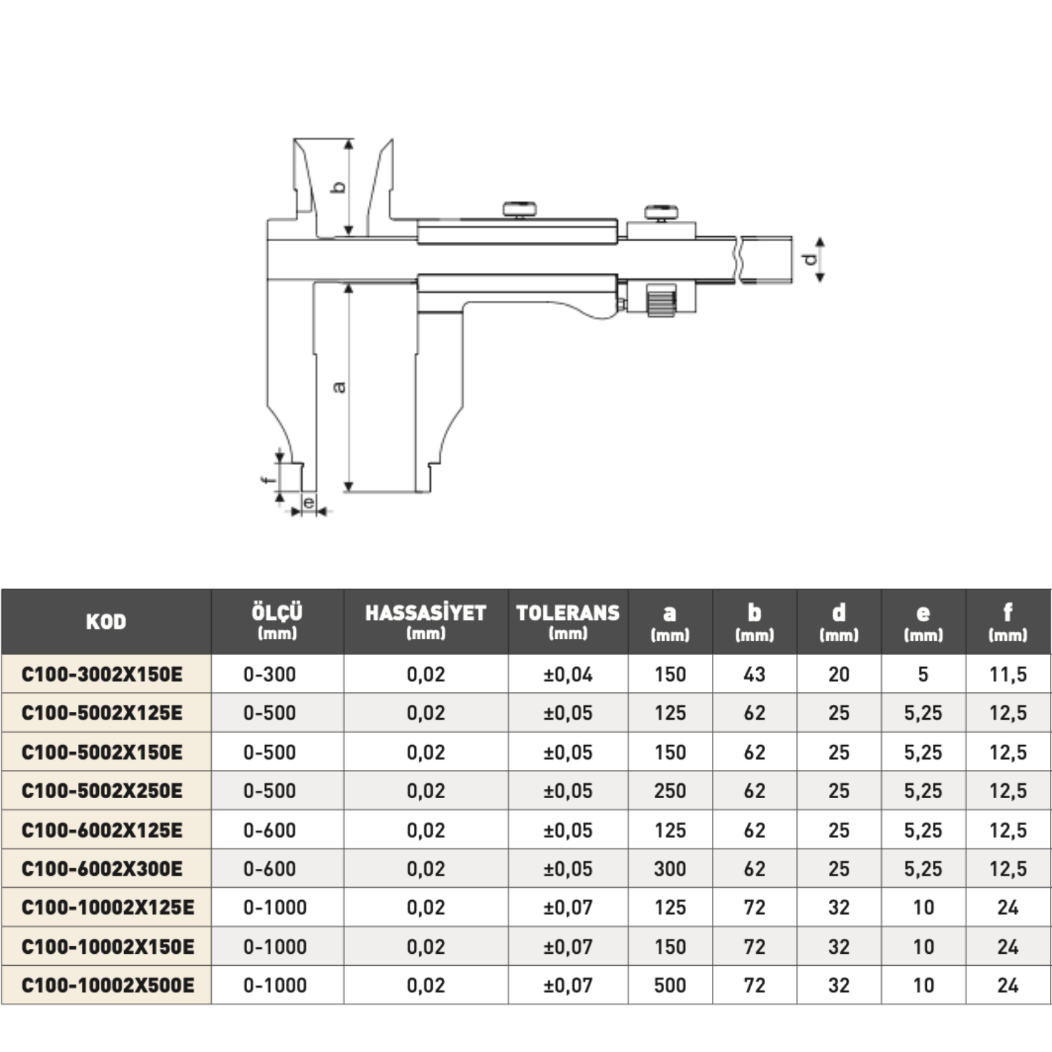 0–300 mm’den 0–1000 mm’ye kadar çeşitli ölçüm aralıklarıyla sunulur. Çift çeneli tasarım, simetrik ve hatasız ölçüm imkanı sağlar. Büyük çaplı parçalar üzerinde çalışan üretim tesisleri için ideal bir çözümdür.