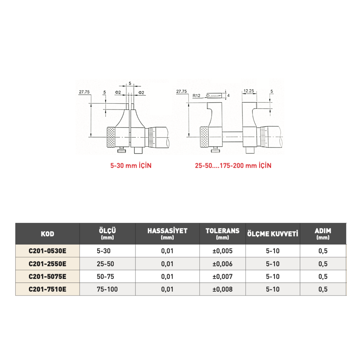 İç çap mikrometresi, 5–30 mm’den 75–100 mm’ye kadar farklı ölçüm aralıklarına sahip modelleriyle boru içleri, motor yatakları ve iç yüzeylerin ölçümünde profesyonel çözüm sunar.
