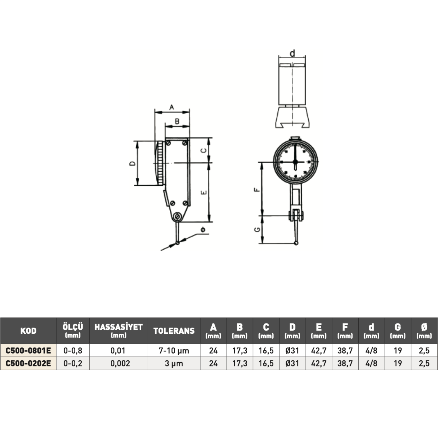 Ekonomik Tip Salgı Komparatör Saatleri, iş parçalarının salgı, eksantriklik ve yüzey kaçıklık ölçümlerinde kullanılan hassas saatli ölçüm cihazlarıdır. C500 serisi modeller 0,002 – 0,008 mm hassasiyet aralığıyla yüksek doğruluk gerektiren işlemler için uygundur.