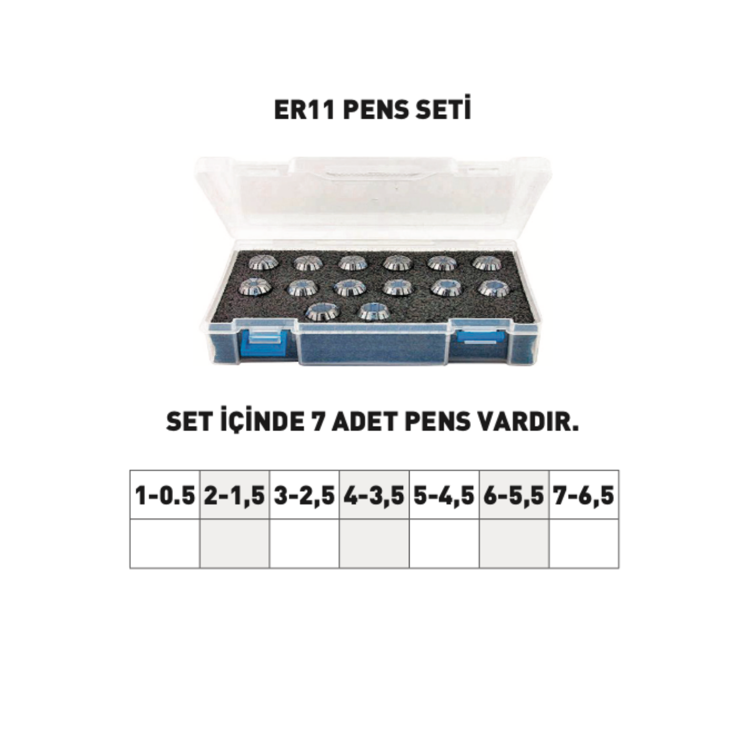 ER11 pens seti, hassas işleme operasyonlarında maksimum performans sunmak için tasarlanmış kompakt bir settir. Set içerisinde 1–0.5, 2–1.5, 3–2.5, 4–3.5, 5–4.5, 6–5.5, 7–6.5 mm ölçülerinde toplam 7 adet pens bulunur.