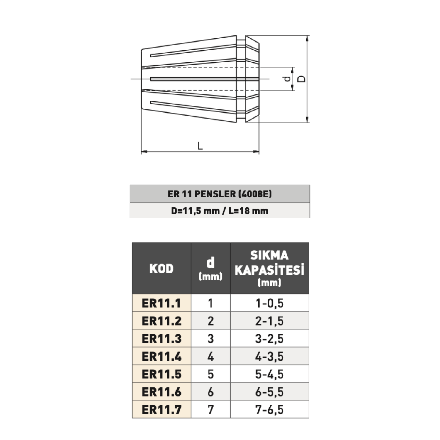 ER 11 pensler, kompakt frezeleme ve delme uygulamaları için en ideal çözümlerden biridir. 11,5 mm dış çap ve 18 mm uzunluk ölçülerine sahip bu seri, küçük takım çaplarında maksimum hassasiyet sunar.
