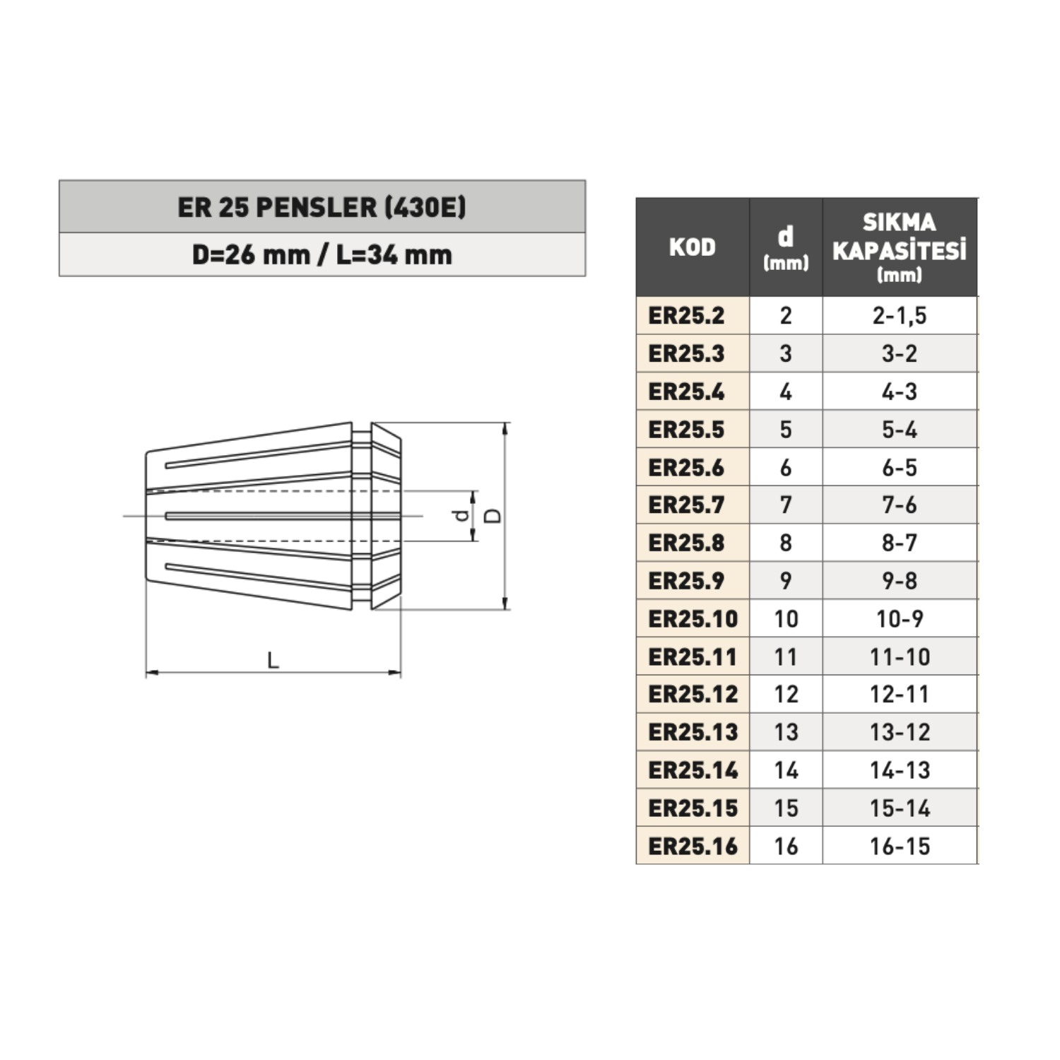 ER25 pensler, CNC tezgâhları ve yüksek hassasiyet gerektiren işleme uygulamaları için ideal bir çözümdür. D=26 mm / L=34 mm ölçülerindeki kompakt yapısıyla hem profesyonel üretimde hem de atölye tipi işlerde maksimum performans sunar.