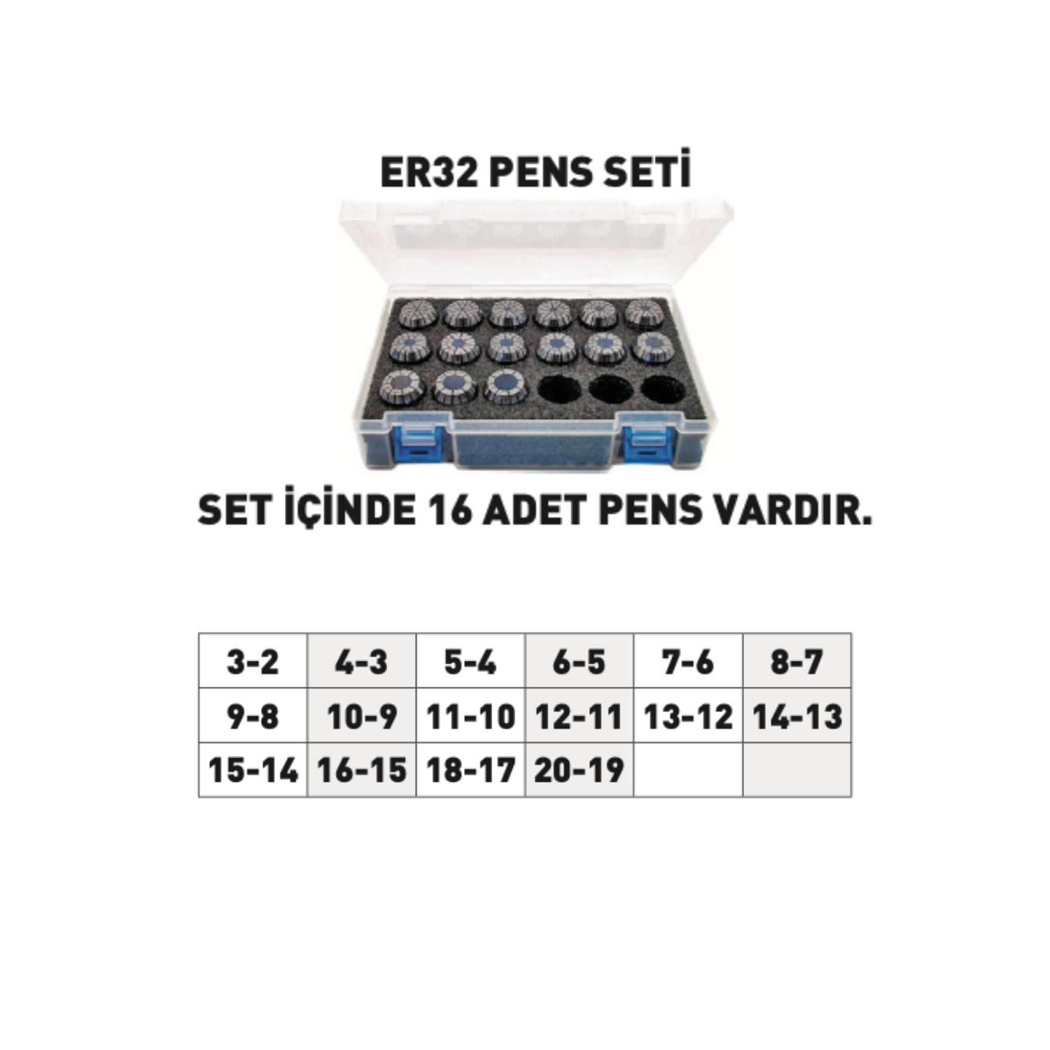 ER32 pens seti, daha büyük takım çaplarını güvenli ve hassas bir şekilde sıkmak için tasarlanmış 16 parçalık kapsamlı bir settir. Endüstriyel üretim, seri imalat ve ağır mesaide yüksek performans sağlar.