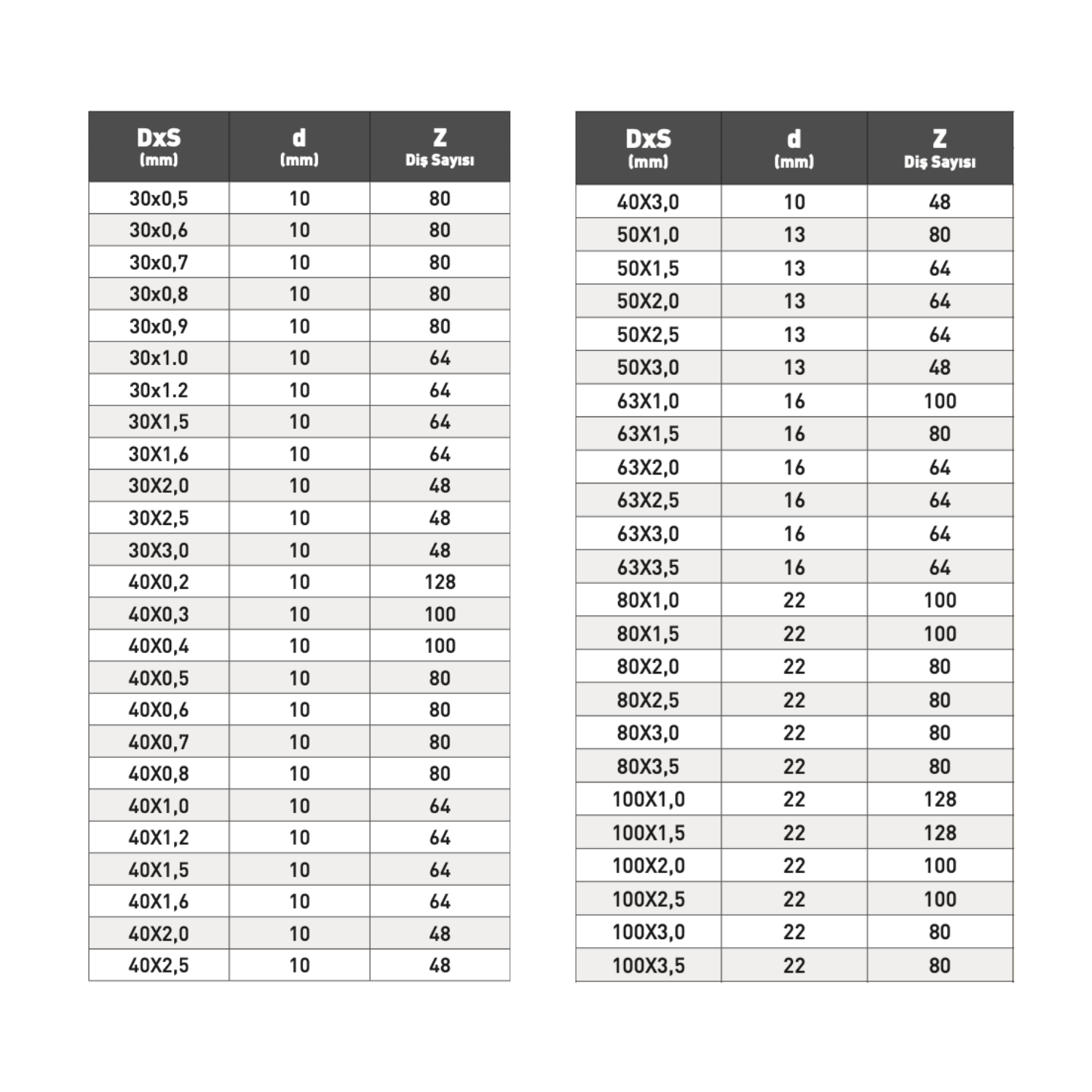 • Diş sayısı (Z): 48, 64, 80, 100, 128
