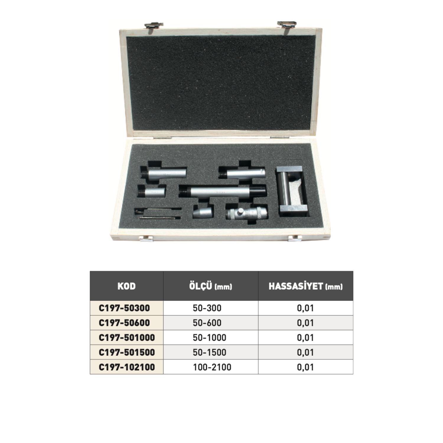 Mekanik iç çap boru mikrometresi, boru iç yüzeylerinin ve iç çap ölçümlerinin en yüksek doğrulukla yapılmasını sağlayan profesyonel bir ölçüm cihazıdır. 50–300 mm’den 100–2100 mm’ye kadar geniş ölçüm aralıkları sunan bu seri, büyük çaplı boru, silindir, gövde ve rulman yuvalarının ölçümünde güvenilir sonuç verir.