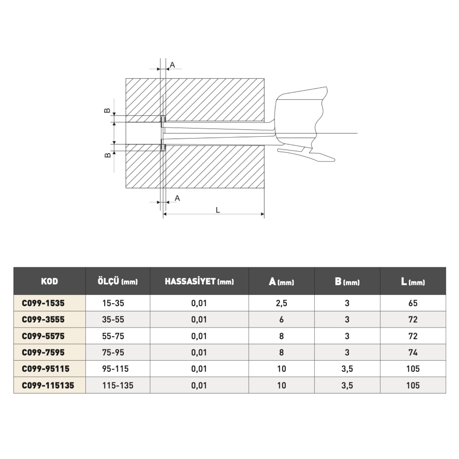 Saatli İç Çap Komparatörleri, iç çap ölçümlerinde yüksek hassasiyet sunan mekanik ölçüm cihazlarıdır. 15 mm’den 135 mm’ye kadar geniş iç çap ölçüm aralığına sahip C099 serisi, üretim alanında hızlı ayar ve kesin sonuçlar sağlar.
