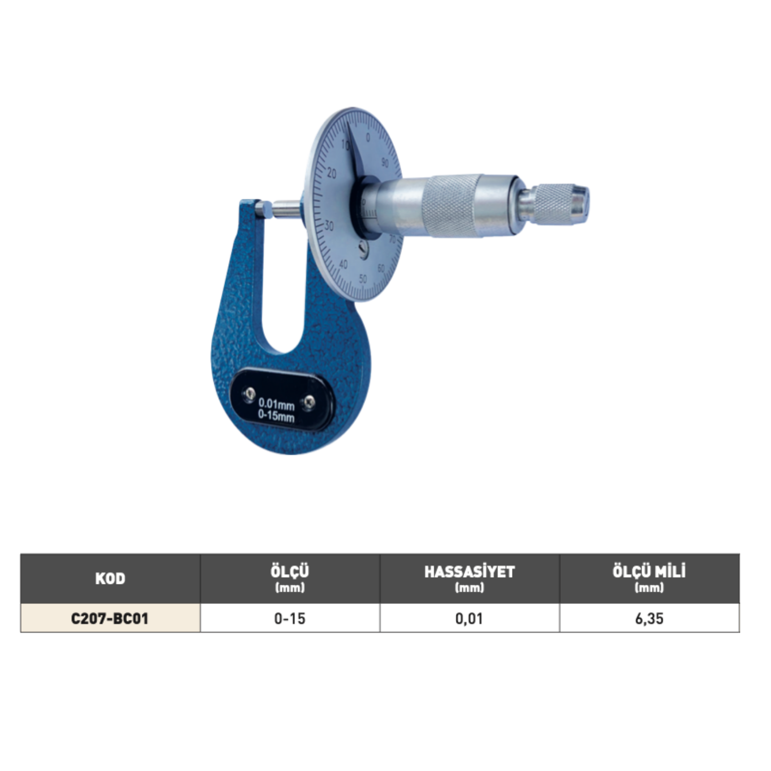 0–15 mm ölçüm aralığı ve 0,01 mm hassasiyet ile metal işleme sektöründe yaygın olarak kullanılır.
