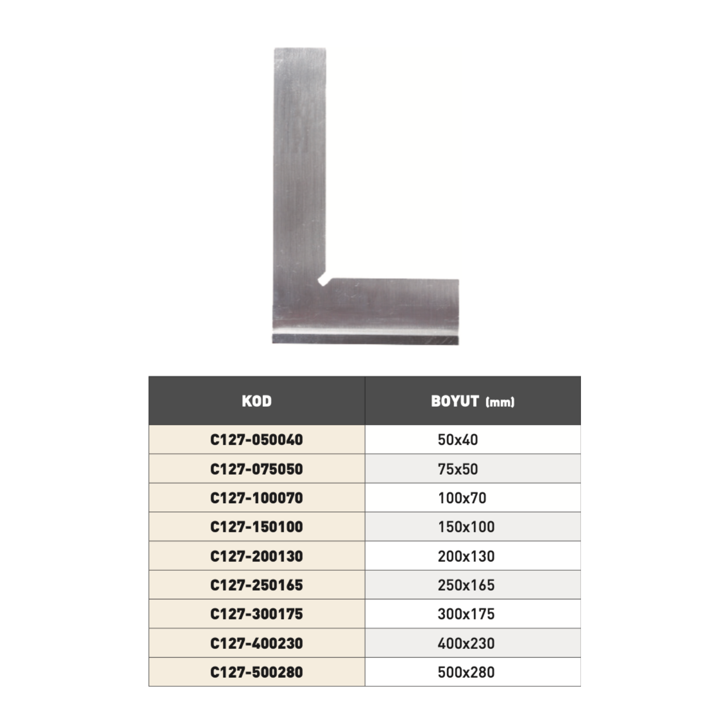 Şapkalı gönye, iş parçalarının diklik kontrolü, hassas kenar kontrolü ve yüzey doğrulama işlemleri için kullanılan en güvenilir ölçü ekipmanlarından biridir. DIN 875/2 standardına uygun C127 serisi, farklı boyut seçenekleri ile atölyelerden kalite kontrol laboratuvarlarına kadar geniş kullanım alanı sunar.