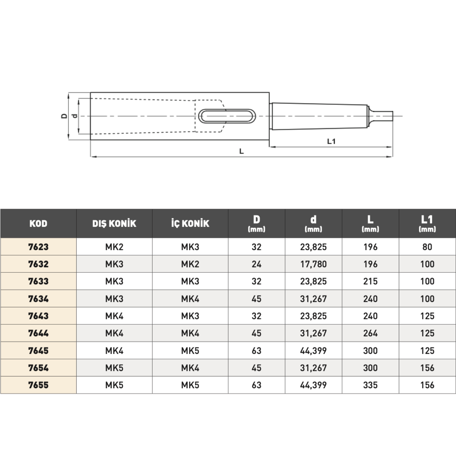 • Bu ürün serisinde MK2, MK3, MK4 ve MK5 olmak üzere farklı dış konik seçenekleri bulunur.