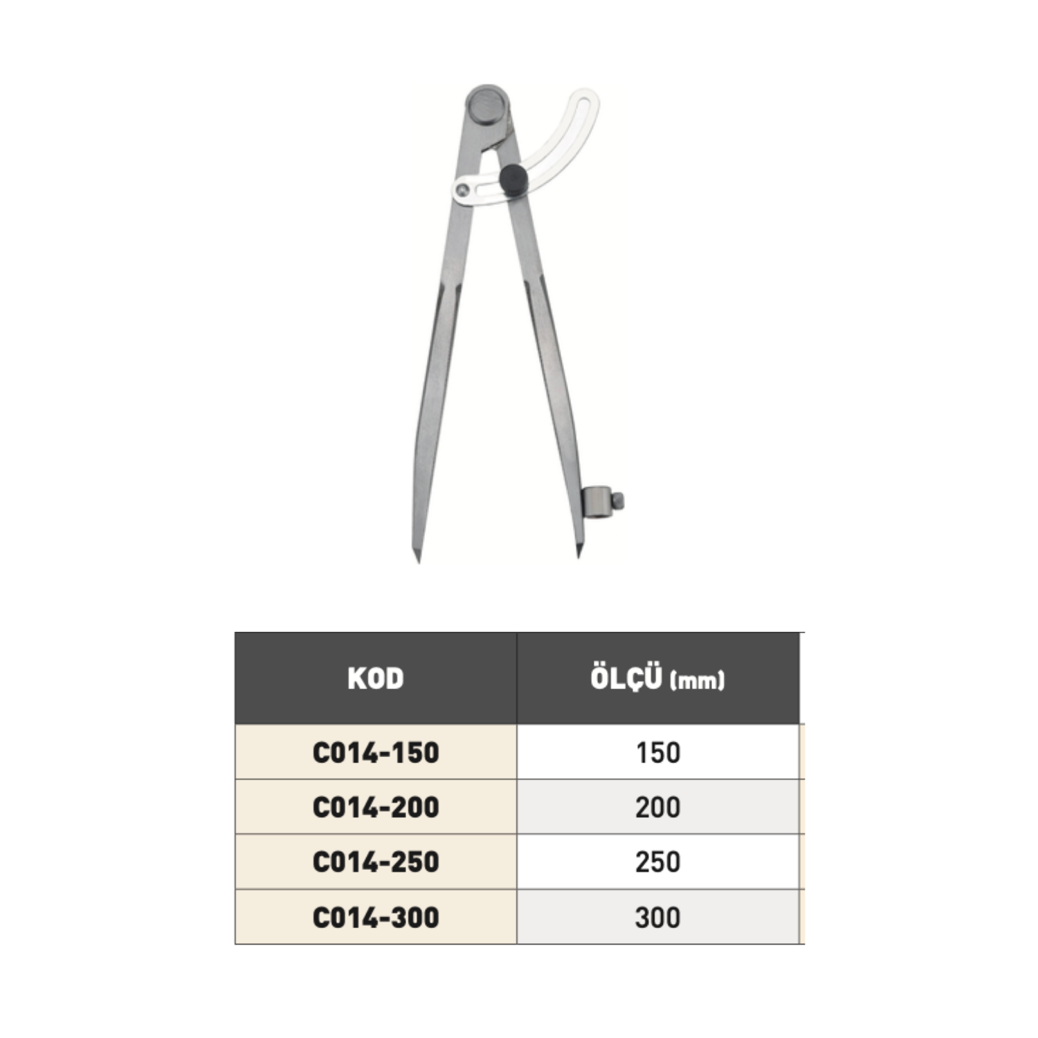 Kalem tutuculu pergel, daire ve yay şekilleri çizmek için geliştirilmiş pratik bir ölçüm ve çizim aracıdır. C014 serisi, 150 mm’den 300 mm’ye kadar farklı ölçülerde sunulur.