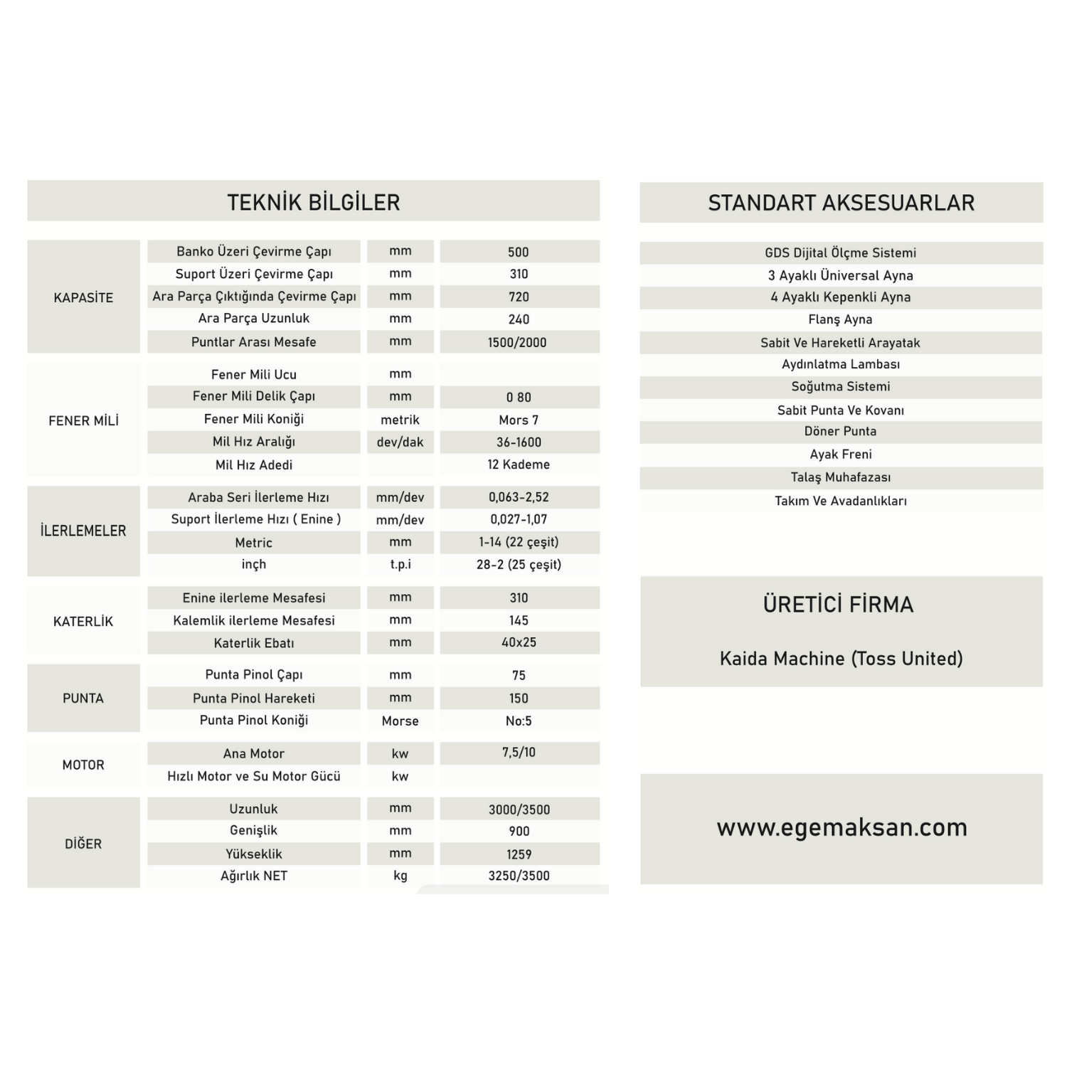 Banka üzerinde 500 mm, suport üzerinde 310 mm çevirme çapına sahip olan TU 500B, orta ölçekli iş parçalarının güvenli ve rahat şekilde işlenmesini sağlar. Ara parça çıkıntısında 720 mm çevirme kapasitesi ve 1500 / 2000 mm puntalar arası mesafe seçenekleri ile farklı üretim ihtiyaçlarına esnek çözümler sunar.