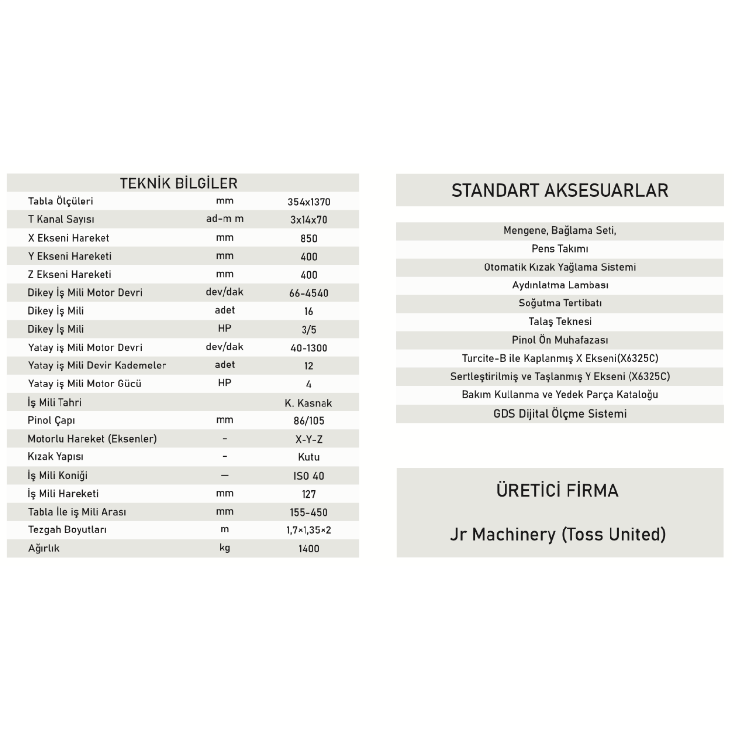 TOSS UNITED TU X6325C Üniversal Freze Tezgâhı, yüksek motor gücü, hassas mekanik yapısı ve zengin donanımı ile üretim süreçlerinde kaliteyi ve verimliliği artıran güvenilir bir yatırımdır. Uzun ömürlü, güçlü ve hassas bir freze tezgâhı arayan işletmeler için ideal bir tercihtir.