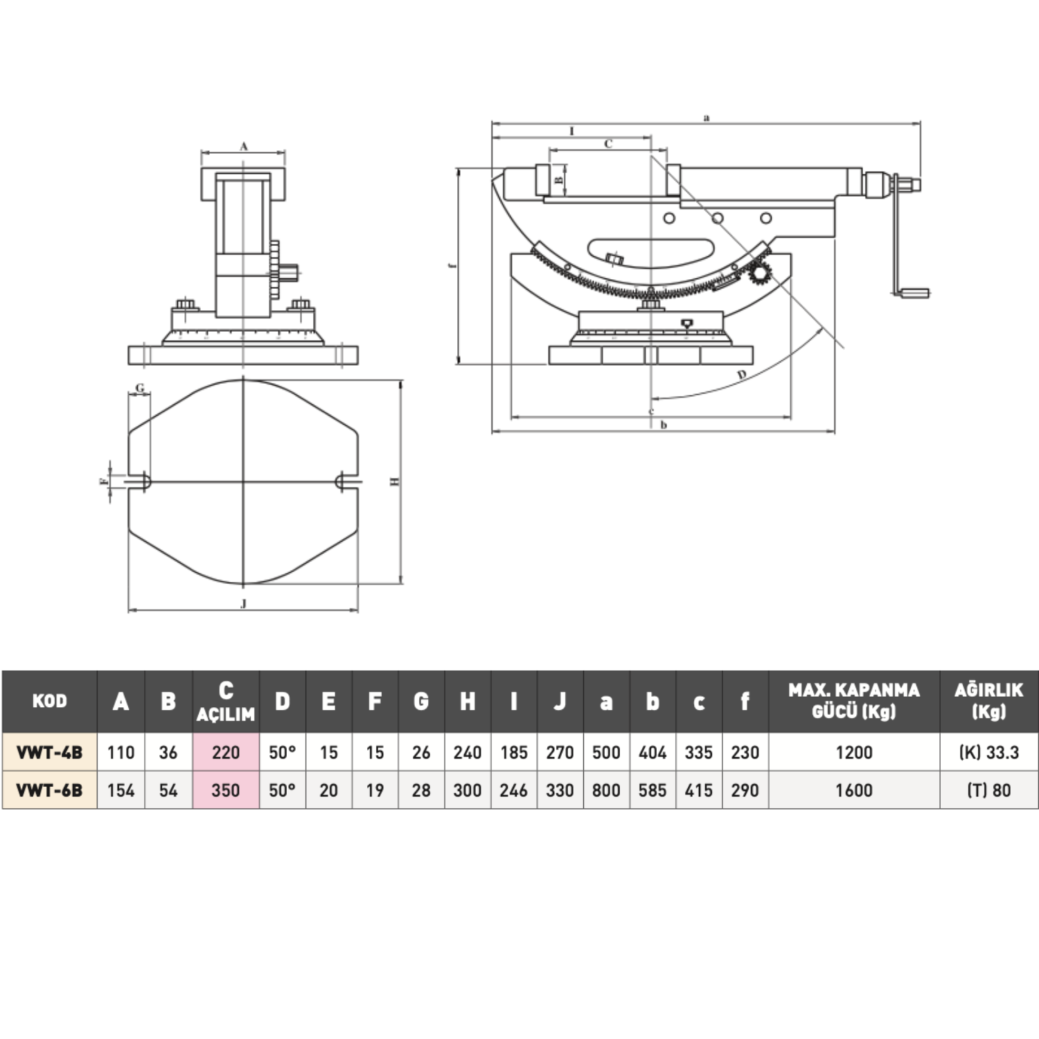 WVT-6B modeli ise daha büyük işler için geliştirilmiştir. 350 mm çene açılımı ve 1600 kg’lık maksimum sıkma gücüyle ağır ve geniş parçaların sabitlenmesinde mükemmel performans gösterir. Yaklaşık 80 kg ağırlığındaki bu model, güçlü gövdesiyle uzun süreli ve yoğun üretim ortamlarında yüksek dayanıklılık sunar.