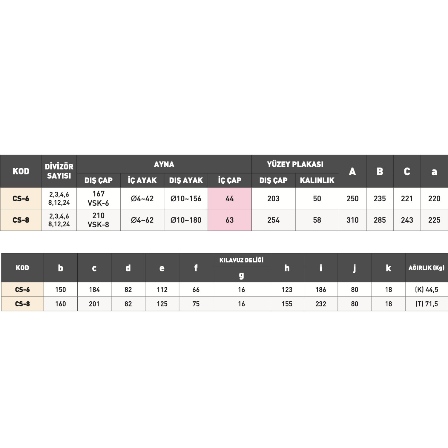 • Merkez Deliği: CS-6 → 42 mm | CS-8 → 63 mm