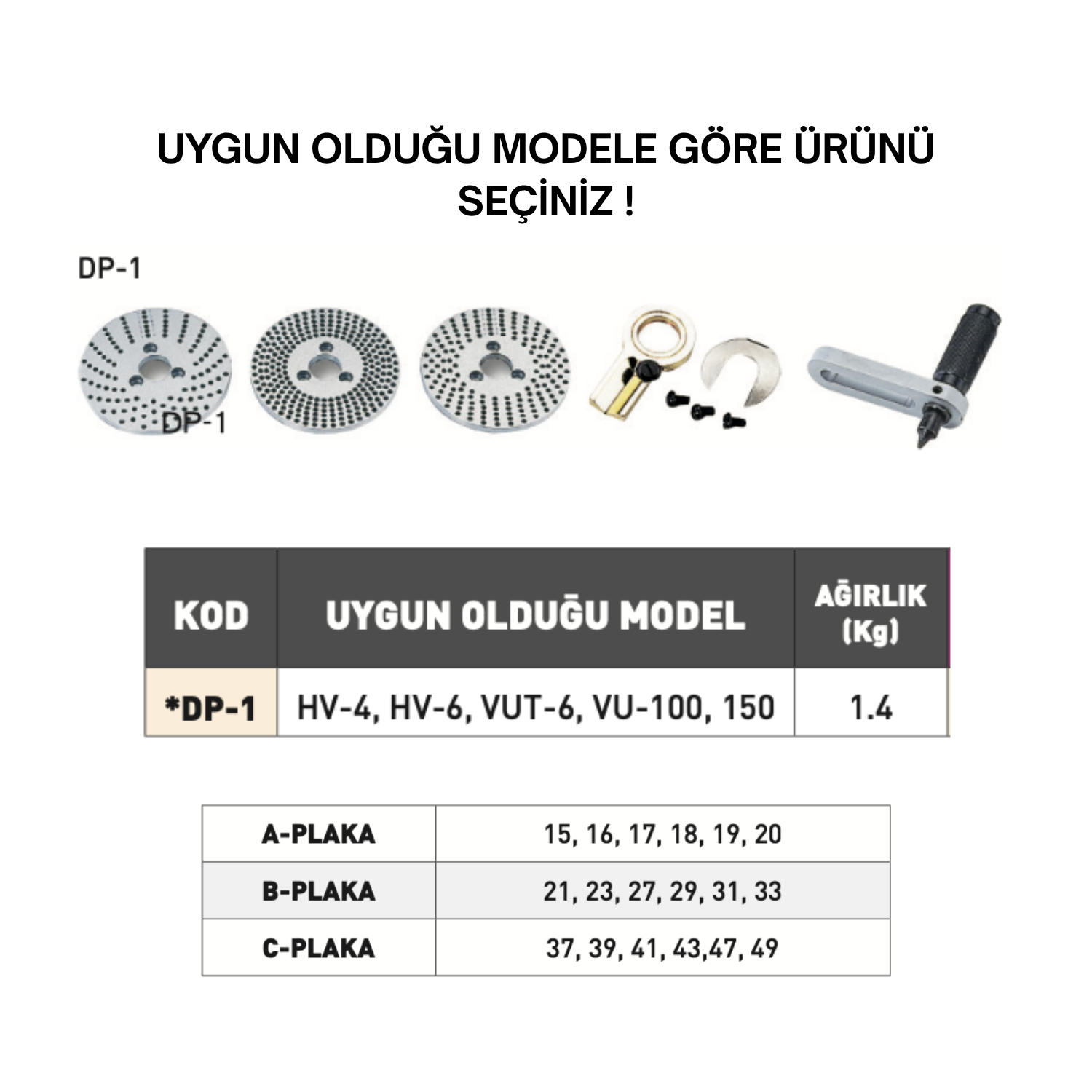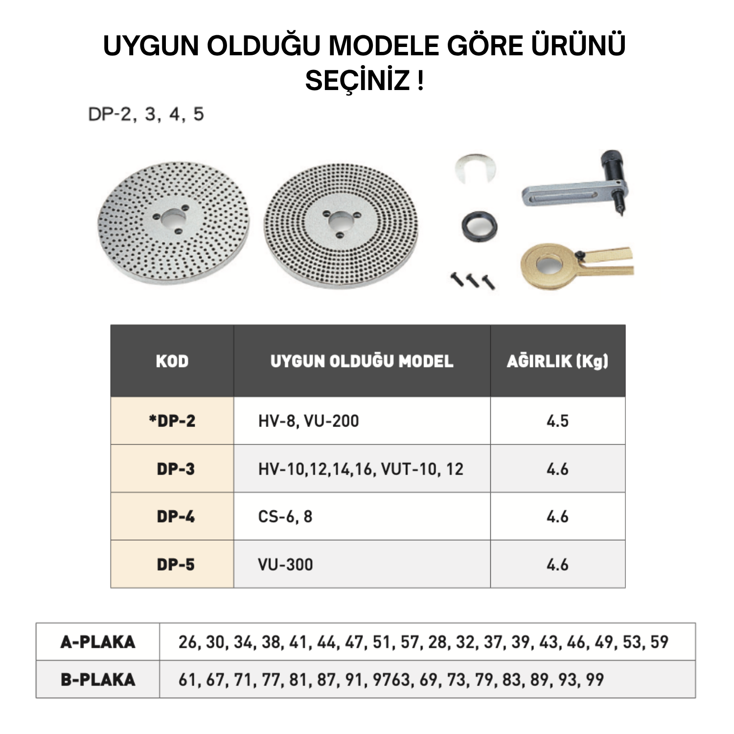 DP-1, DP-2, DP-3, DP-4 ve DP-5 olmak üzere farklı model seçenekleri, HV-4’ten HV-200’e kadar çeşitli döner tabla modellerine uygun olarak üretilmiştir. Plakalar, milimetrik aralıklarla hassas bölme işlemlerine olanak tanıyan delik dizilimlerine sahiptir.