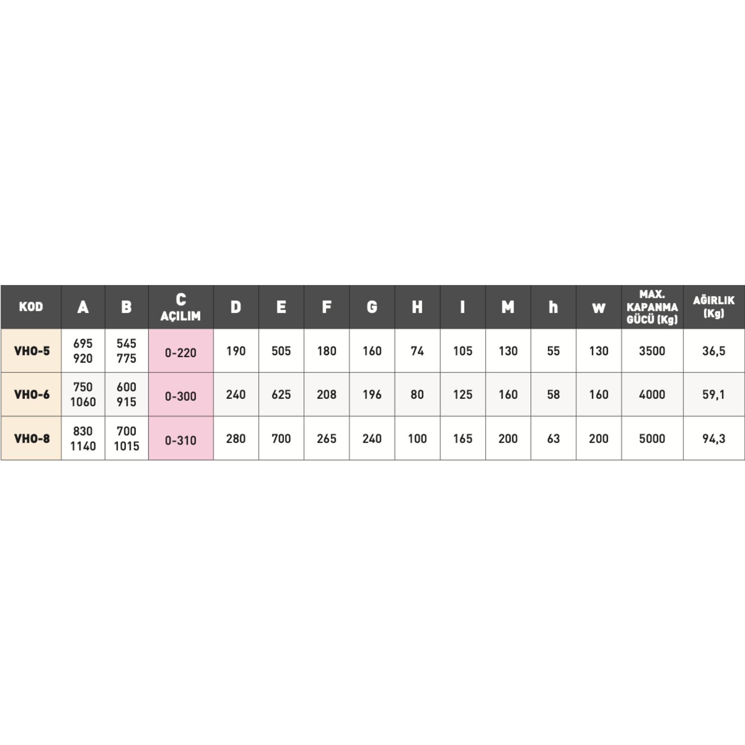 • VHO-5 modeli, 220 mm’ye kadar açılım kapasitesine sahip olup 3500 kg maksimum kapanma gücü sunar. 36,5 kg ağırlığıyla kompakt ve güçlü bir yapıya sahiptir.
