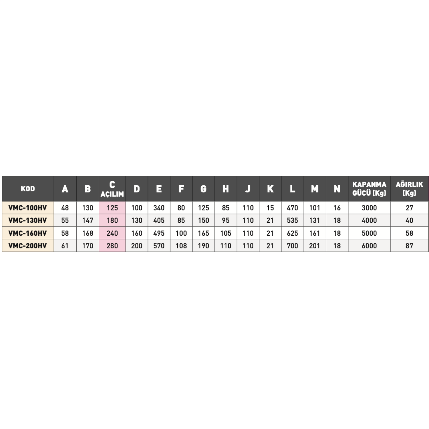 • VMC-160HV modeli: 280 mm açılım kapasitesiyle 6000 kg sıkma gücü sunar. 58 kg ağırlığıyla güçlü ve dengeli bir yapıya sahiptir.