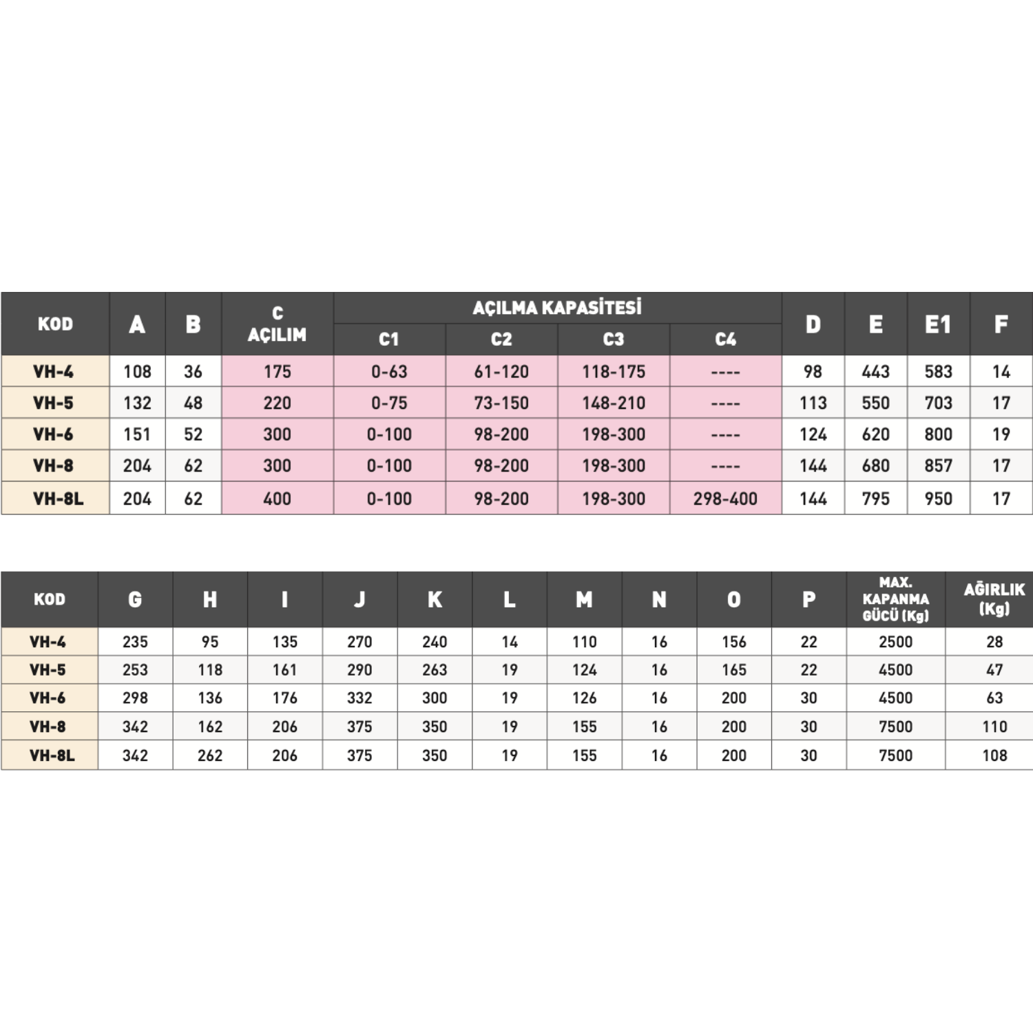 • VH-4 modeli 175 mm açılım kapasitesine ve 2500 kg maksimum kapanma gücüne sahiptir. Kompakt yapısıyla hassas işlemler için uygundur.