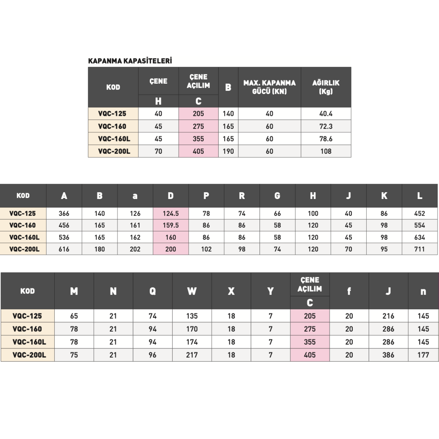 • VQC-200L modeli: Serinin en güçlü modeli olup 405 mm çene açılımı ve 90 kN maksimum kapanma gücü sunar. 108 kg ağırlığa sahip bu model, ağır sanayi uygulamaları için idealdir.