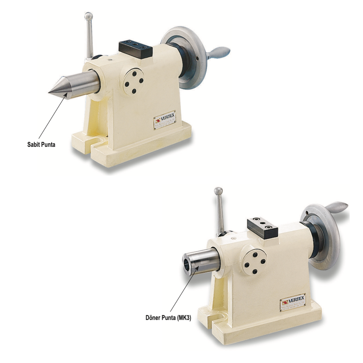 Vertex, farklı tezgah ve döner tabla boyutlarına uygun olarak iki tip karşı punta sunar: Sabit Punta ve Döner Punta (MK3).