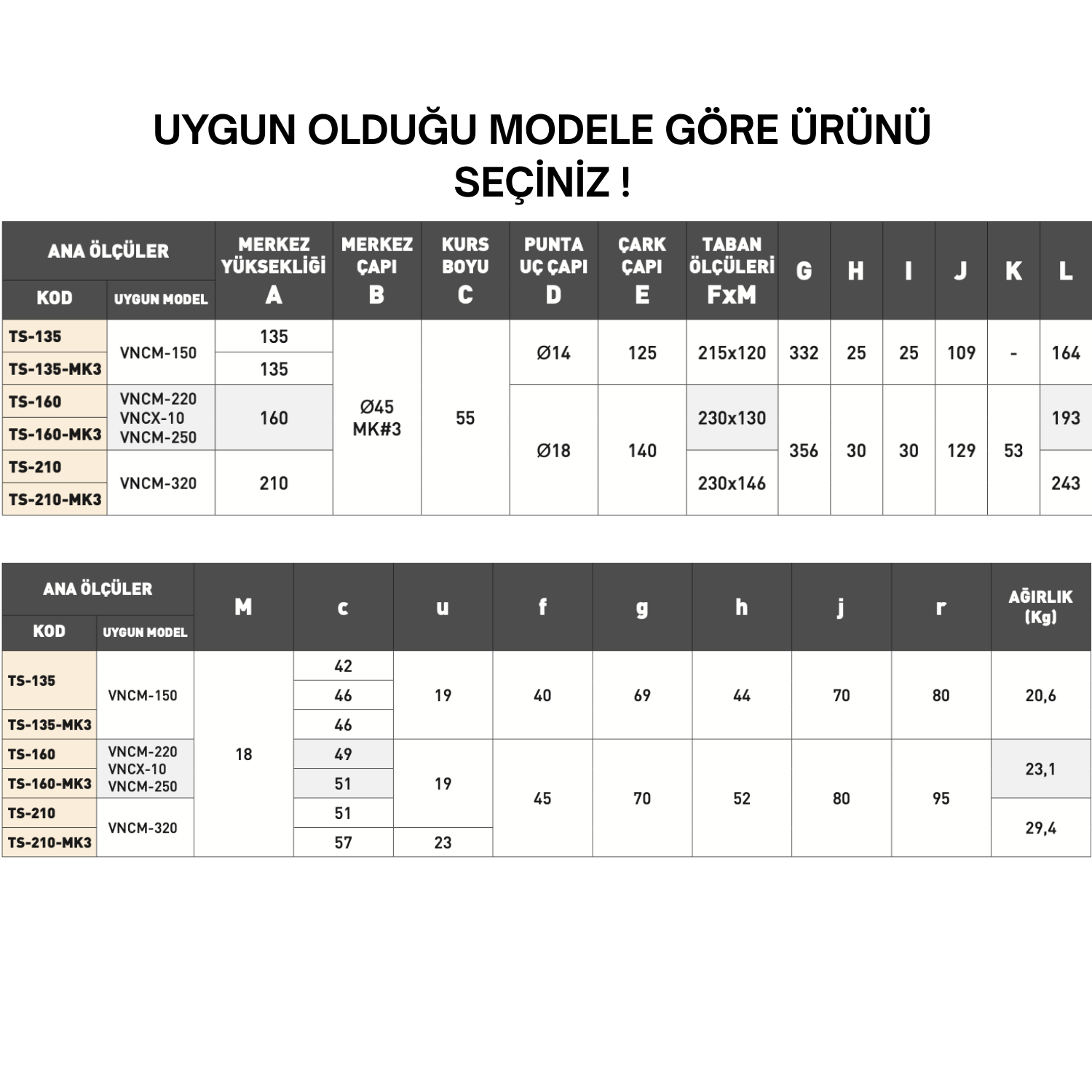 • TS-135 – VNCM-150 döner tablalar için uygundur.