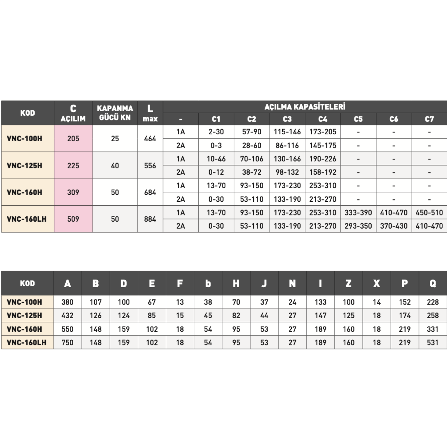 • VNC-125H modeli: 225 mm açılım, 40 kN sıkma gücü ve 51 kg ağırlığıyla orta ölçekli işlemler için idealdir.